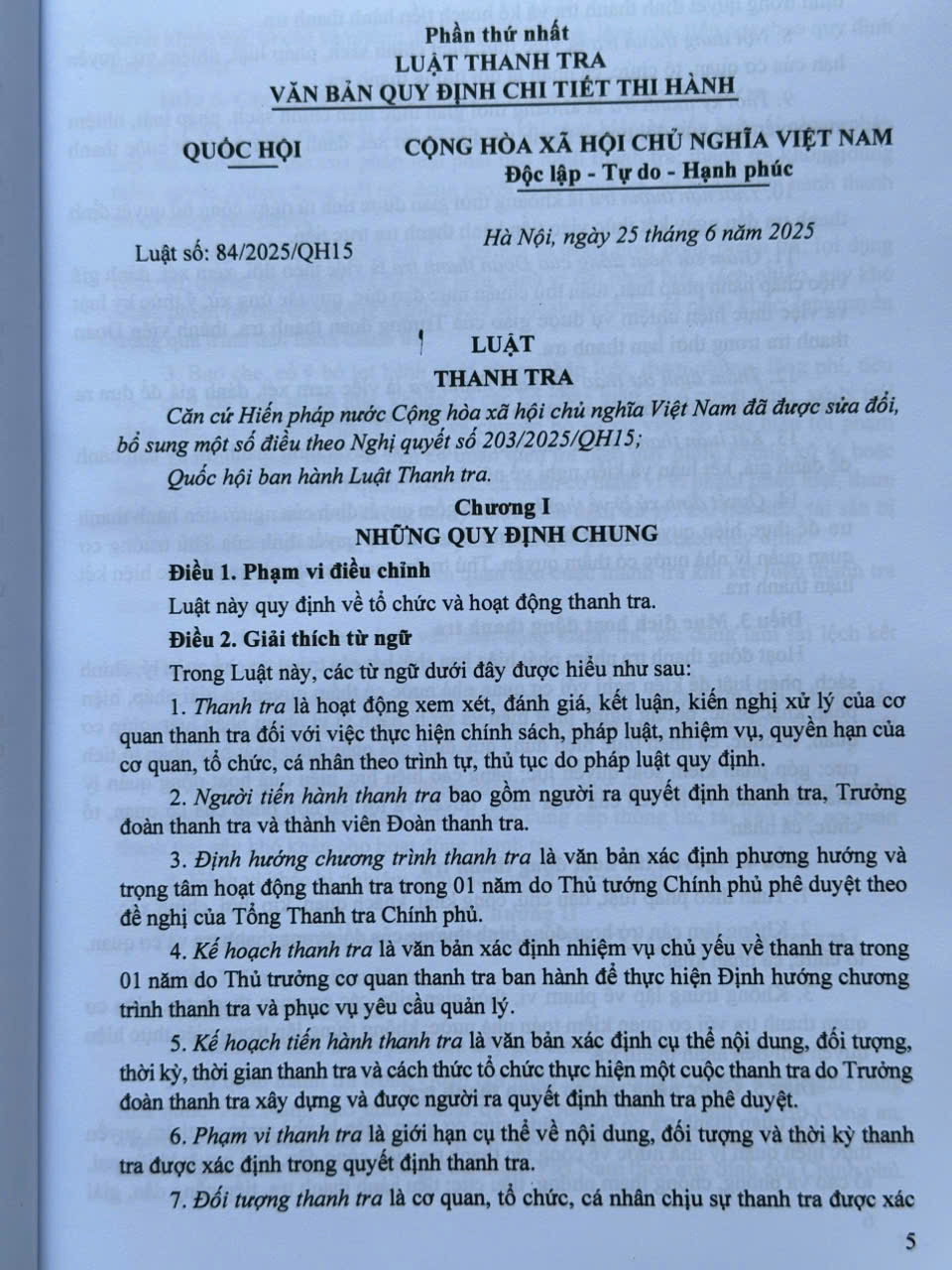 Ngày 25 tháng 6 năm 2025 tại Kỳ họp thứ 9, Quốc hội khóa XV đã thông qua Luật số 84/2025/QH15 của Quốc hội ban hành Luật Thanh tra (sau đây gọi tắt là Luật Thanh tra 2025), có hiệu lực thi hành từ ngày 01 tháng 7 năm 2025.
