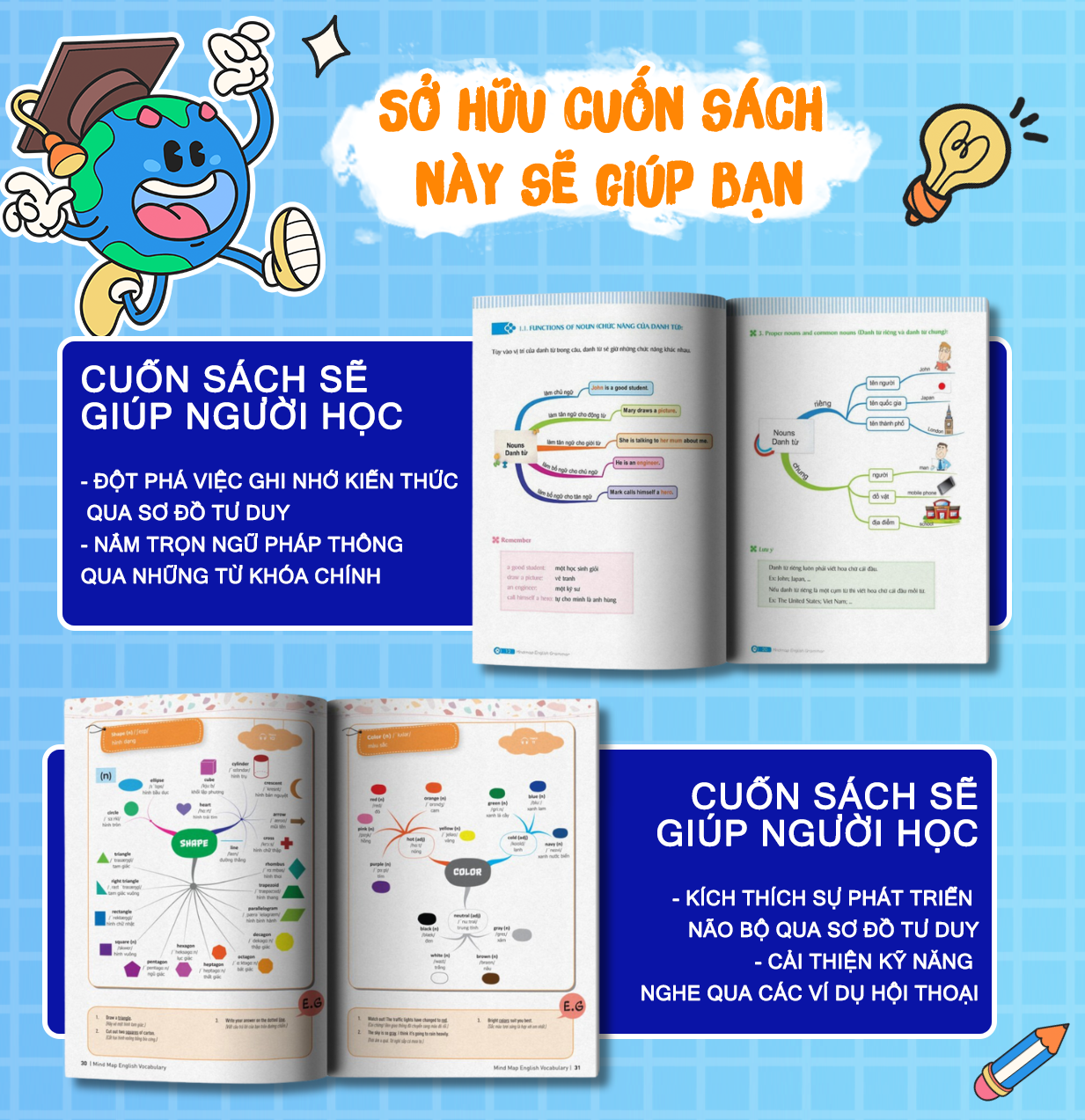 Cuốn sách ngữ pháp tiếng Anh bằng sơ đồ tư duy chính là giải pháp dành cho người học cách khắc phục những nhược điểm của mình bằng việc sử dụng sơ đồ tư duy