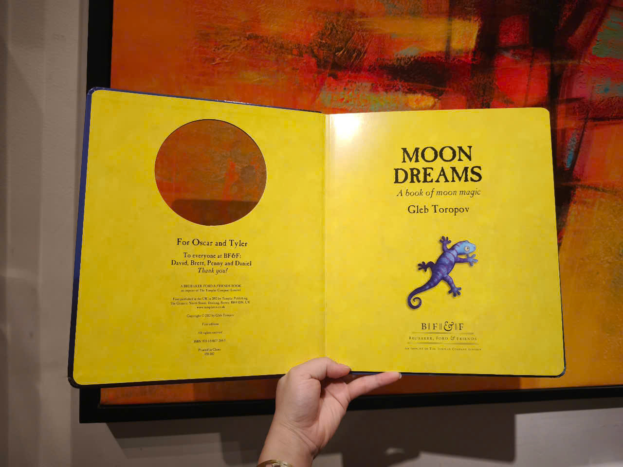 The moon holds secrets for animals as well as for children. A fish looking at a crescent moon through the ripples of a stream thinks it is a writhing caterpillar. To butterflies, a crescent moon looks like a delicious banana. To mice, a half moon looks like cheese... In this picture book, with lines cut through it, the moon takes on many shapes, growing larger and larger until it shines full upon a little boy.