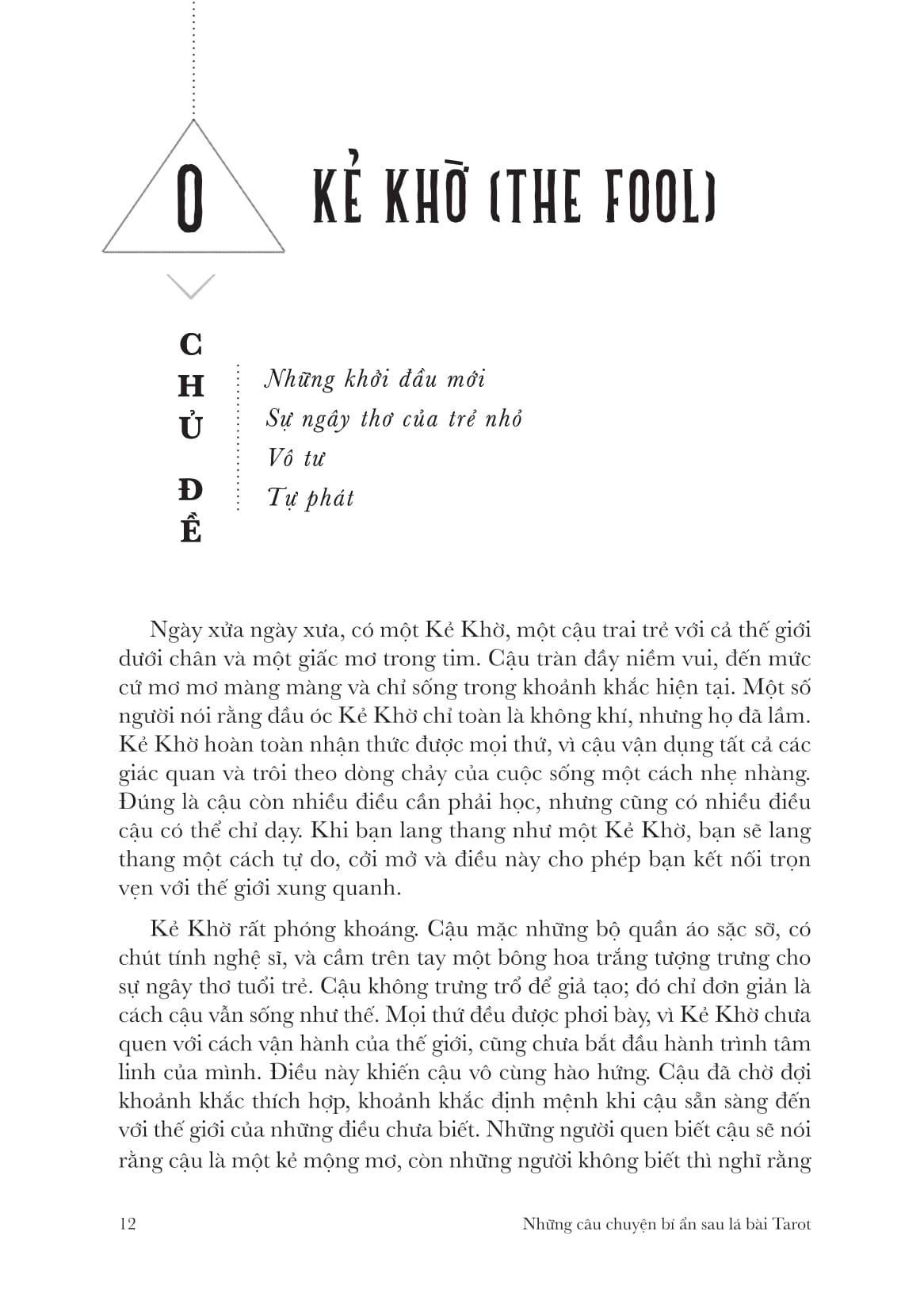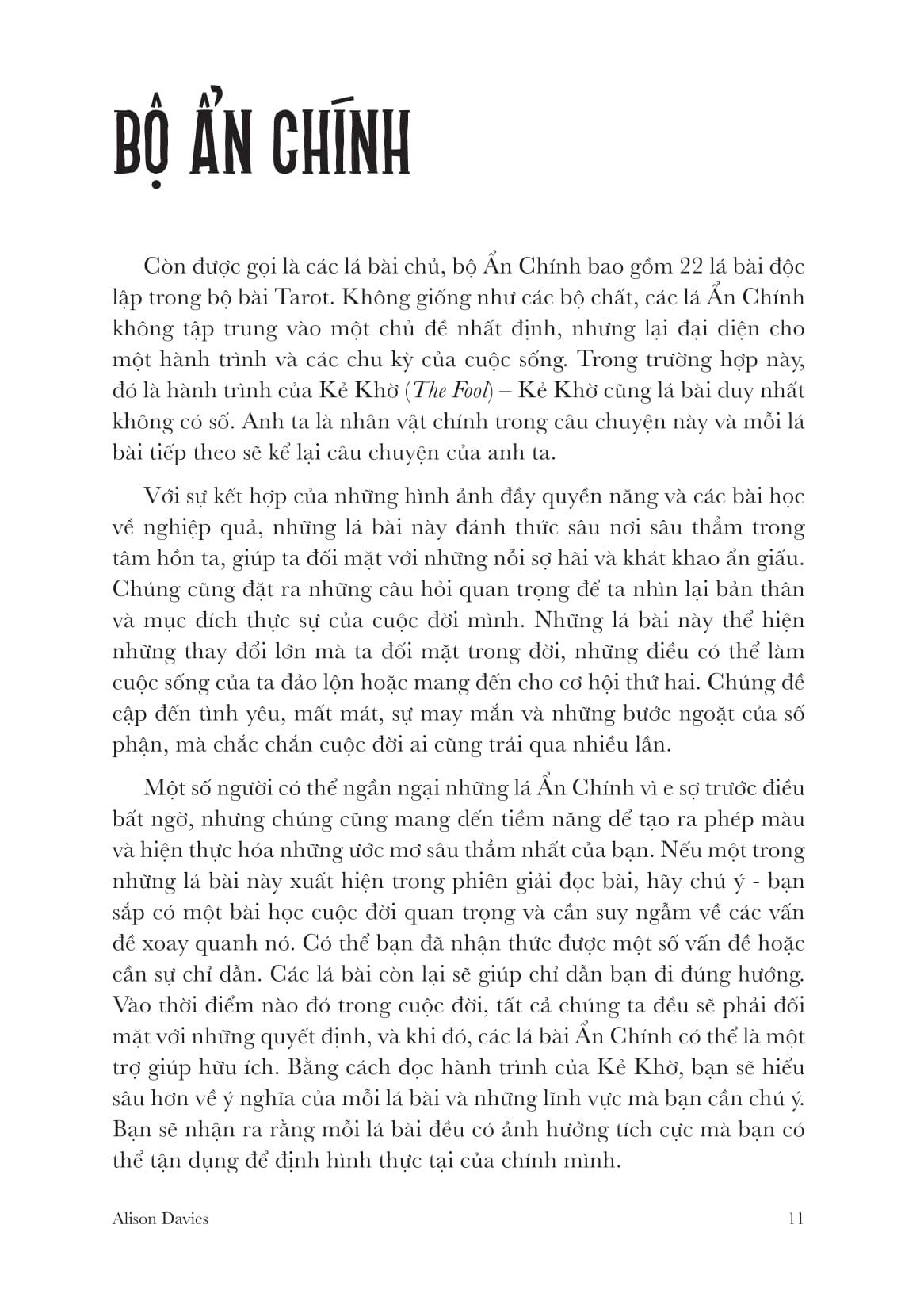 Tarot không đơn giản chỉ là những lá bài đầy màu sắc; đó là một vũ trụ huyền bí, mê hoặc và ẩn chứa nhiều thông điệp sâu sắc. Mỗi lá bài đều có một câu chuyện riêng, những biểu tượng tâm linh kết hợp với nhau một cách tài tình, trở thành một công cụ tuyệt vời để bạn khám phá câu chuyện của một ai đó hoặc của chính m.ình. Những câu chuyện bí ẩn sau lá bài Tarot của tác giả - chuyên gia kể chuyện Alison Davies sẽ dẫn dắt bạn bước vào hành trình Tarot màu nhiệm ấy, hướng dẫn bạn kết nối với các hình ảnh của từng lá bài trong bộ bài Rider-Waite Smith, để hiểu sâu – nắm chắc – cảm nhận được trọn vẹn nhất một bộ bài Tarot.