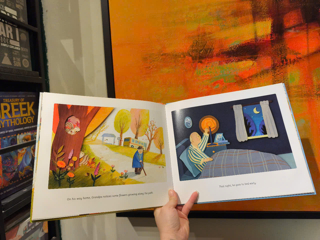 Mỗi sáng, ông nội đều làm theo thói quen thường ngày của mình. Ông uống trà, tưới cây, dọn dẹp và đi xe buýt vào thị trấn. Ông nội thích những công việc hàng ngày của mình, nhưng có một ngày trong tuần đặc biệt hơn. Đó là ngày ông có thể ghé thăm cửa hàng thủ công, mua hai suất bánh bao mang đi và có thể hái một số bông hoa mà ông nhìn thấy dọc đường. Với văn bản giản dị và hình minh họa màu nước ấm áp tuyệt vời cùng giấy cắt chỉ để được nghiền ngẫm, câu chuyện về tình yêu đơn nhất giữa ông và cháu gái của Joowon Oh sẽ nằm gọn trong trái tim của mọi độc giả.