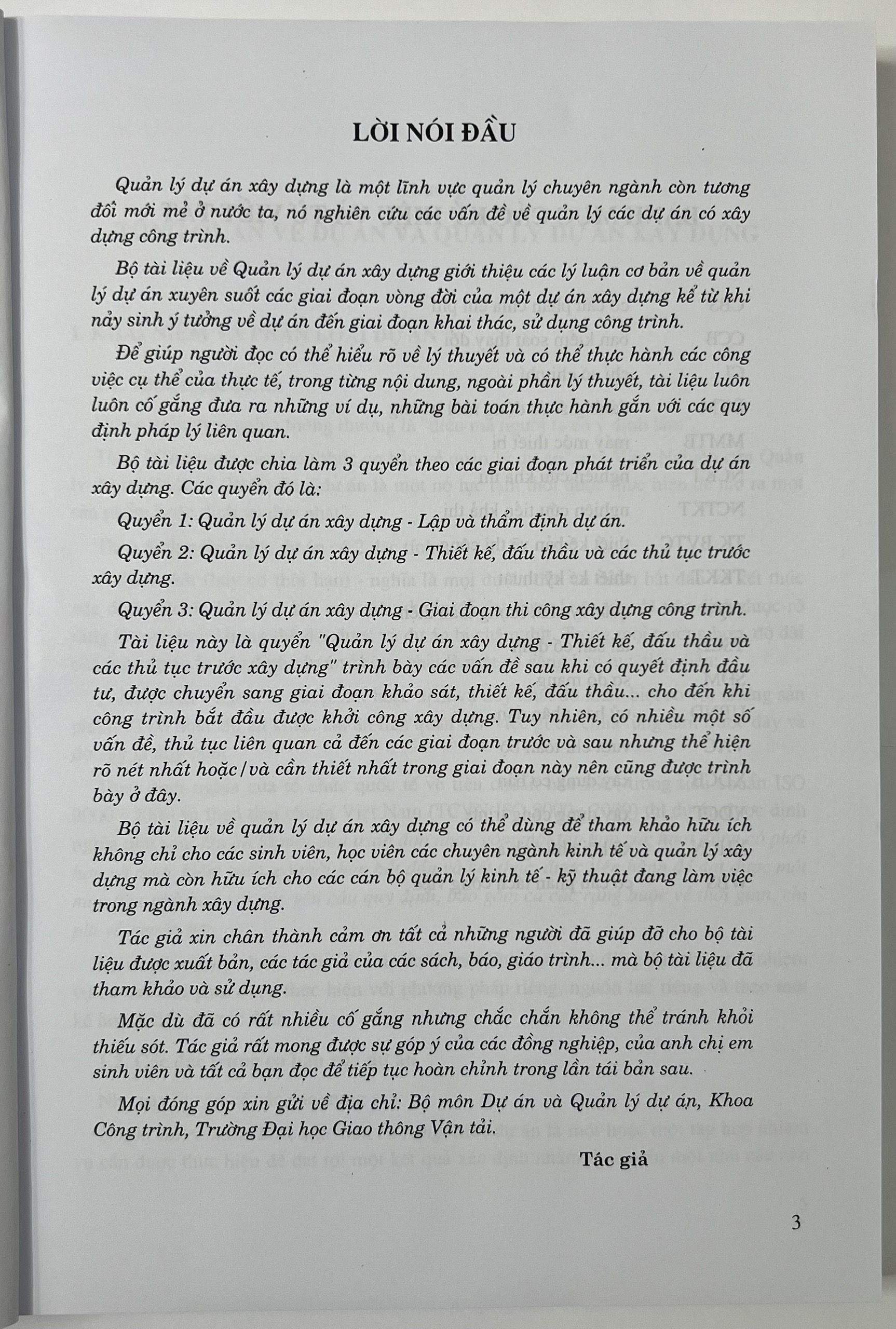 Tài liệu này là quyển "Quản lý dự án xây dựng - Thiết kế, đấu thầu và các thủ tục trước xây dựng" trình bày các vấn đề sau khi có quyết định đầu tư, được chuyển sang giai đoạn khảo sát, thiết kế, đấu thầ cho đến khi công trình bắt đầu được khởi công xây dựng. Tuy nhiên, có nhiều một số vấn đề, thủ tục liên quan cả đến các giai đoạn trước và sau nhưng thể hiện rõ nét nhất hoặc và cần thiết nhất trong giai đoạn này nên cũng được trình bày ở đây.