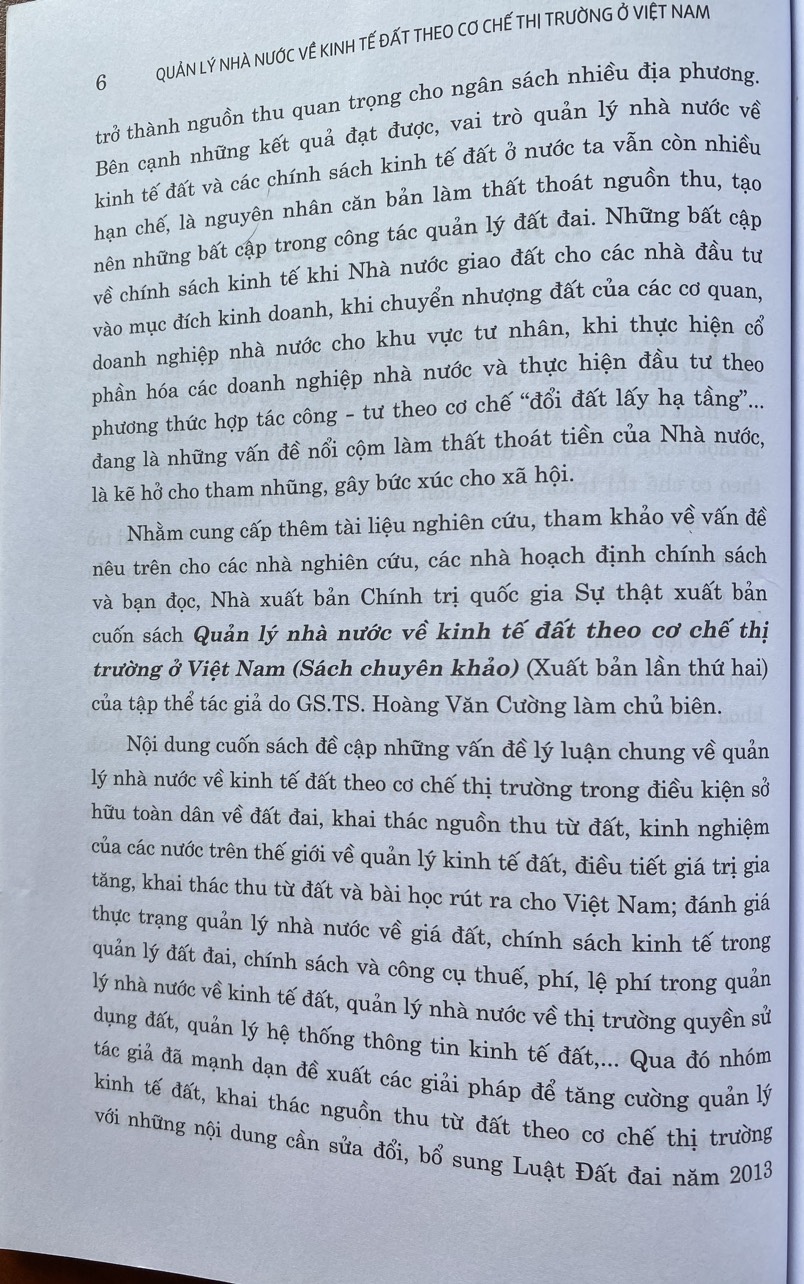 Cuốn sách " QUẢN LÝ NHÀ NƯỚC VỀ KINH TẾ ĐẤT THEO CƠ CHẾ THỊ TRƯỜNG Ở VIỆT NAM" nội dung trong cuốn sách đề cập những vấn đề lý luận chung về quản lý nhà nước về kinh tế đất theo cơ chế thị trường trong điều kiện sở hữu toàn dân về đất đai, khai thác nguồn thu từ đất, kinh nghiệm của các nước trên thế giới về quản lý kinh tế đất, điều tiết giá trị gia tăng, khai thác thu từ đất và bài học rút ra cho Việt Nam; đánh giá thực trạng quản lý nhà nước về giá đất, chính sách kinh tế trong quản lý đất đai, chính sách và công cụ thuế, phí, lệ phí trong quản lý nhà nước về kinh tế đất, quản lý nhà nước về thị trường quyền sử dụng đất, quản lý hệ thống thông tin kinh tế đất,... Qua đó nhóm tác giả đã mạnh dạn đề xuất các giải pháp để tăng cường quản lý kinh tế đất, khai thác nguồn thu từ đất theo cơ chế thị trường với những nội dung cần sửa đổi, bổ sung Luật Đất đai năm 2013 về quản lý và sử dụng công cụ giá đất theo cơ chế thị trường; quản lý và sử dụng công cụ thuế đất theo cơ chế thị trường; hoàn thiện chính sách giao đất, cho thuê đất, thu hồi và bồi thường khi thu hồi đất đảm bảo phân chia hài hòa lợi ích giữa các bên và tăng cường nguồn thu từ đất; hoàn thiện quản lý hệ thống thông tin về kinh tế đất;...
