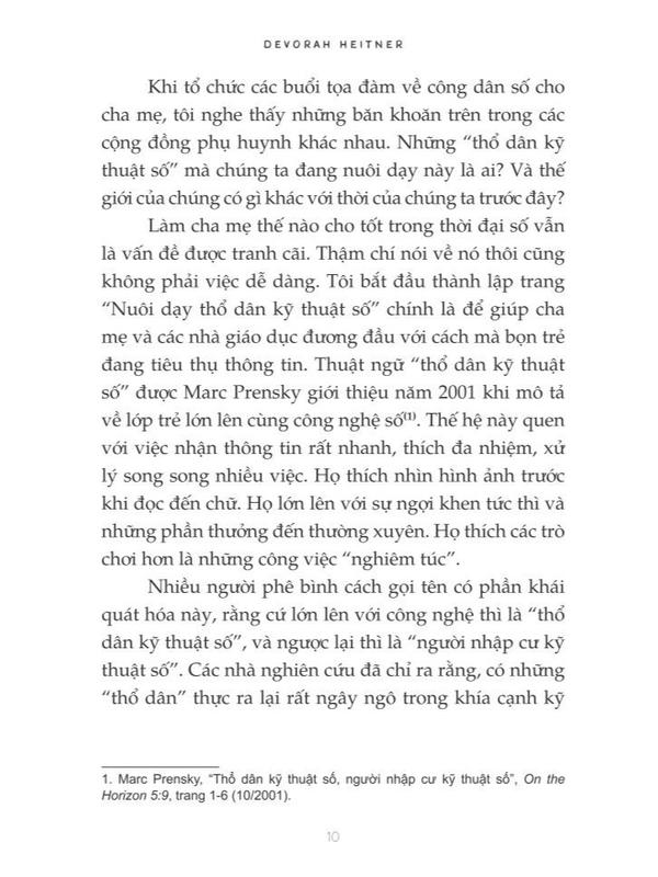 Tiến sĩ Devorah Heitner là người sáng lập Raising Digital Natives (Nuôi dạy thổ dân kỹ thuật số) - nguồn tài liệu dành cho các tổ chức và gia đình có mong muốn nuôi dưỡng văn hóa công dân số trong gia đình mình. Tiến sĩ là đồng tác giả của chương trình Kết nối thông thái trong thời đại số, bài viết của bà được đăng trên tờ New York Times, Edutopia và PBS Kids. Bà Heitner có bằng tiến sĩ về Truyền thông, Công nghệ và Xã hội tại Đại học Northwestern, bà hiện đang giảng dạy tại Đại học DePaul, Street Level Youth Media, và Đại học Northwestern. Bà thường xuyên được mời làm diễn giả tại các trường học, các hội thảo trong nước cũng như quốc tế. Tiến sĩ Heitner hiện đang sống cùng gia đình tại Chicago.