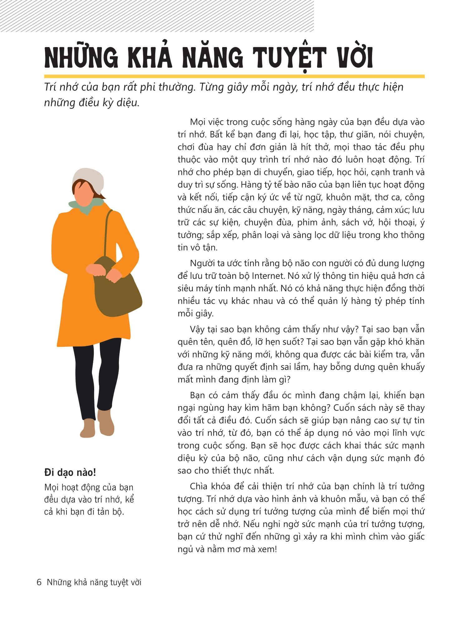 - Hiểu được trí nhớ của bản thân thay đổi như thế nào theo thời gian và bạn có thể làm gì để giữa cho tâm trí luôn khỏe mạnh khi về già Một cuốn sách dành cho mọi lứa tuổi, từ các bạn học sinh sinh viên muốn ghi nhớ kiến thức trên lớp, vượt qua kỳ thi,… cho đến các việc ứng dụng trí nhớ trong công việc hàng ngày, rèn luyện trí nhớ cả khi về già.