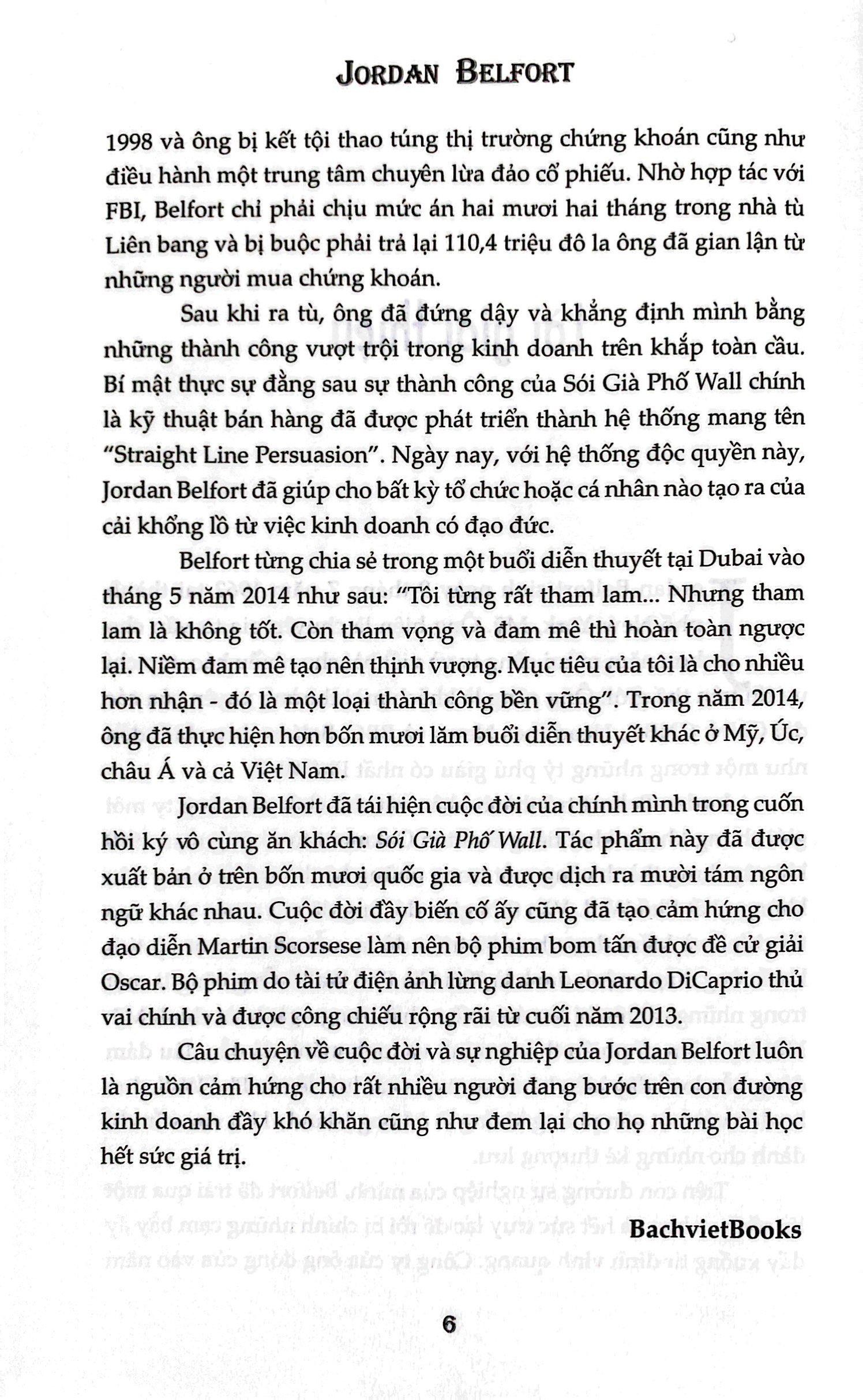 SÓI GIÀ Phố Wall - Phần 2 Cuốn hồi ký không nên đọc ngắt quãng được viết bởi “Chủ nhân trẻ của vũ trụ phố Wall” Sói già Phố Wall là cuốn tự truyện của Jordan Belfort - một huyền thoại trong ngành môi giới chứng khoán trên sàn phố Wall. Tác phẩm kể về quá trình phất lên của Jordan nói riêng, cũng như nội tình cuộc đại khủng hoảng tín dụng thứ cấp ở Mỹ nói chung. Được mọi người gọi với nhiều biệt danh, trong đó, cái tên Sói Già Phố Wall là hợp với Jordan hơn cả - một con sói tối thượng đội lốt cừu non. Ngoại hình và cách hành xử của anh ta trông giống như một đứa trẻ nhưng thực chất, anh ta đâu có trẻ con. Anh ta là một thằng đàn ông ba mươi mốt tuổi nhưng già đời như một lão sáu mươi, "sống theo thang tuổi của loài chó" - một năm bằng bảy năm tuổi người.Vừa tốt nghiệp đại học, bước vào khởi nghiệp, Jordan Belford đã gặp ngay thất bại đầu đời trên phố Wall, bởi anh ta mới chỉ là “cừu non” giữa bao “sói già” khác vây quanh. Chàng trai có cặp mắt xanh, cái miệng dẻo quẹo, cao chỉ tầm một thước bảy chẳng còn cách nào khác, phải chuyển hướng để kiếm việc. Anh ta tìm đến một công ty bé xíu để thử vận may. Chính nơi làm việc vô danh tiểu tốt này đã nhanh chóng trở thành “vườn ươm” cho tài năng bán hàng và môi giới của anh chàng Jordan Belford hiếu thắng, nhanh nhẹn, nhiều mưu lược. Cũng từ đây, gã trùm tài chính tương lai dần thọc tay vào nhiều ngõ ngách của thế giới phù hoa, hào nhoáng, gia nhập đội ngũ “buôn tiền” khét tiếng, từng bước khuynh đảo thị tường chứng khoán phố Wall.Sớm trở nên giàu có sau những vụ IPO nổi đình đám, nâng giá cổ phiếu từ “rác” trở thành “vàng”, đại gia Jordan Belford đã vượt mặt những tay trùm từng một thời vênh váo, biết chống chịu với những cơn stress trong cái nghề đầy áp lực. Với rất nhiều mánh lới trong kinh doanh, Sói Già đã trở thành triệu phú thị trường chứng khoán ở tuổi hai mươi sáu, bị kết án ở cấp liên bang năm ba mươi sáu tuổi. Anh ta tiệc tùng như một ngôi sao nhạc rock, sống như một ông hoàng và bước qua mọi thăng trầm của đời m.ình như một biểu tượng của các doanh nhân nước Mỹ. Từ một cậu bé bán kem dạo trong những kỳ nghỉ hè ở Italia, Jordan trở thành người có thể kiếm hàng triệu đô trong phút chốc bằng những mánh lới xoay đủ chiều, có khi còn lợi dụng cả những người thân bên m.ình. Anh ta cũng sớm học được cách nốc rượu thay nước lọc, chơi cocain, bao gái, và tiệc tùng lõa thể thâu đêm suốt sáng. Là con “sói già” vô cùng tỉnh táo trên thương trường, nhưng trong đời riêng, không ít lần hắn rơi vào cảm giác vô thức. Trong cuộc đời Jordan Belford, dẫu từng có bao gái đẹp vây quanh, nhưng kết cục vẫn là “từng người tình đã bỏ ta đi”. Sói Già cũng có gia đình. Ly hôn với người vợ đầu - người đã gắn bó khăng khít với anh ta khi còn hàn vi, Jordan cưới ngay một cô gái làm người mẫu quảng cáo cho một hãng bia bởi vẻ đẹp hớp hồn của cô ta. Họ cùng hai đứa con xinh xắn chung sống trong một ngôi nhà đồ sộ, đội ngũ người hầu hai hai người làm việc toàn thời gian, hai vệ sĩ tận tụy cũng những chiếc camera lắp đặt ở mọi nơi, tất cả những đồ vật trong nhà, cho dù những thứ nhỏ nhặt, đều được mua với giá ít nhất là vài nghìn đô la. Những phi vụ tài chính của Sói Già trót lọt trong cả chục năm trời. Cuối cùng, sau hơn năm năm kể từ lúc bị Ủy ban Chứng khoán và Hối đoái truy tố, Jordan mới thật sự phải vào tù - chịu án hai mươi hai tháng tại một trại giam cấp liên bang. Gia đình anh ta cũng đổ vỡ khi người vợ xinh đẹp quyết định ly hôn. Sói già phố Wall không đơn thuần là một cuốn hồi ký. Nó giống như một lời cảnh báo của Jordan Belfort về ngành tài chính, chứng khoán phố Wall, sự tham lam của các nhà đầu cơ, những nguy hiểm tiềm tang trên con đường danh vọng. Trong cuốn sách này, ông cũng đã trực tiếp nhìn nhận những sai lầm trong quá khứ của chính m.ình, từ đó thẳng thắn lên án và vạch trần lối sống xa hoa vô độ, dâm dục của một bộ phận lớn tư bản Mỹ. THÔNG TIN TÁC GIẢ Jordan Belfort là chuyên gia tư vấn cho hơn 50 công ty và viết bài cho nhiều báo, tạp chí uy tín trên thế giới, trong đó có The New York Times, The Wall Street Journal, The Los Angeles Times, The London Times, The Herald Tribune, Le Monde, Corriere della Serra, Forbes, Business Week, Paris Match, Rolling Stone. Cuốn tự truyện của ông đã được xuất bản tại hơn 40 quốc gia và dịch ra 18 ngôn ngữ khác nhau. Ông là khách mời thường xuyên trên các đài CNN, CNBC, BBC,…. Câu chuyện cuộc đời ông đã được đạo diễn Scorsese chuyển thể thành phim và công chiếu rất rộng rãi từ cuối 2013. Bộ phim có sự tham gia của tài từ Leonardo Di Caprio trong vai Jordan Belfort.