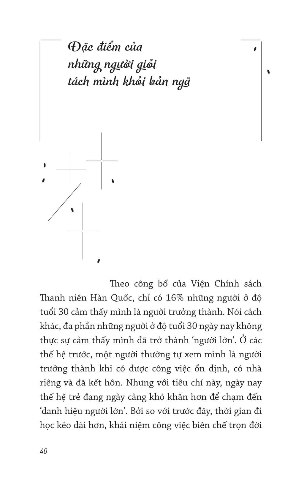 Tuổi 30 ngày nay không còn giống tuổi 30 ngày xưa. Đến tuổi này, nếu bạn vẫn chưa ổn định về kinh tế hay về tinh thần thì bạn sẽ vẫn như thuở 20, đầy hoang mang và mơ hồ trước cuộc đời. Tác giả cũng từng trải qua giai đoạn cô đơn và lạc lối như thế. Nhưng nhờ được học ngành tâm lý học mà cô hiểu được nguyên nhân khiến tâm trí bấn loạn không đến từ môi trường bên ngoài hay từ những người xung quanh, mà chính là do cảm giác xa lạ với chính mình. Chỉ sau khi cô đọc vị những cảm xúc ẩn giấu sâu bên trong và gần gũi hơn với nội tâm thì cô mới cải thiện được mối quan hệ với bản thân, với người khác, và thậm chí cả công việc mình đang làm.