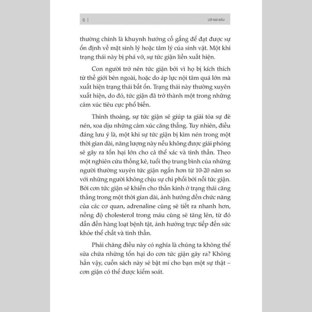 Muốn kiểm soát được cơn giận của bản thân, chúng ta cần phải có nghị lực và tự nhận thức về hậu quả của nó mang lại. Một khi bạn hiểu được nguyên nhân gây ra sự tức giận của mình, bạn sẽ có thể kiểm soát tốt nhất và biến nó thành động lực tích cực để có một cuộc sống tốt đẹp hơn. Hy vọng cuốn sách này sẽ giúp bạn có thể kìm nén được sự tức giận của mình một cách hiệu quả, cải thiện mối quan hệ với những người xung quanh và thực sự sống một cuộc sống hạnh phúc và bình yên