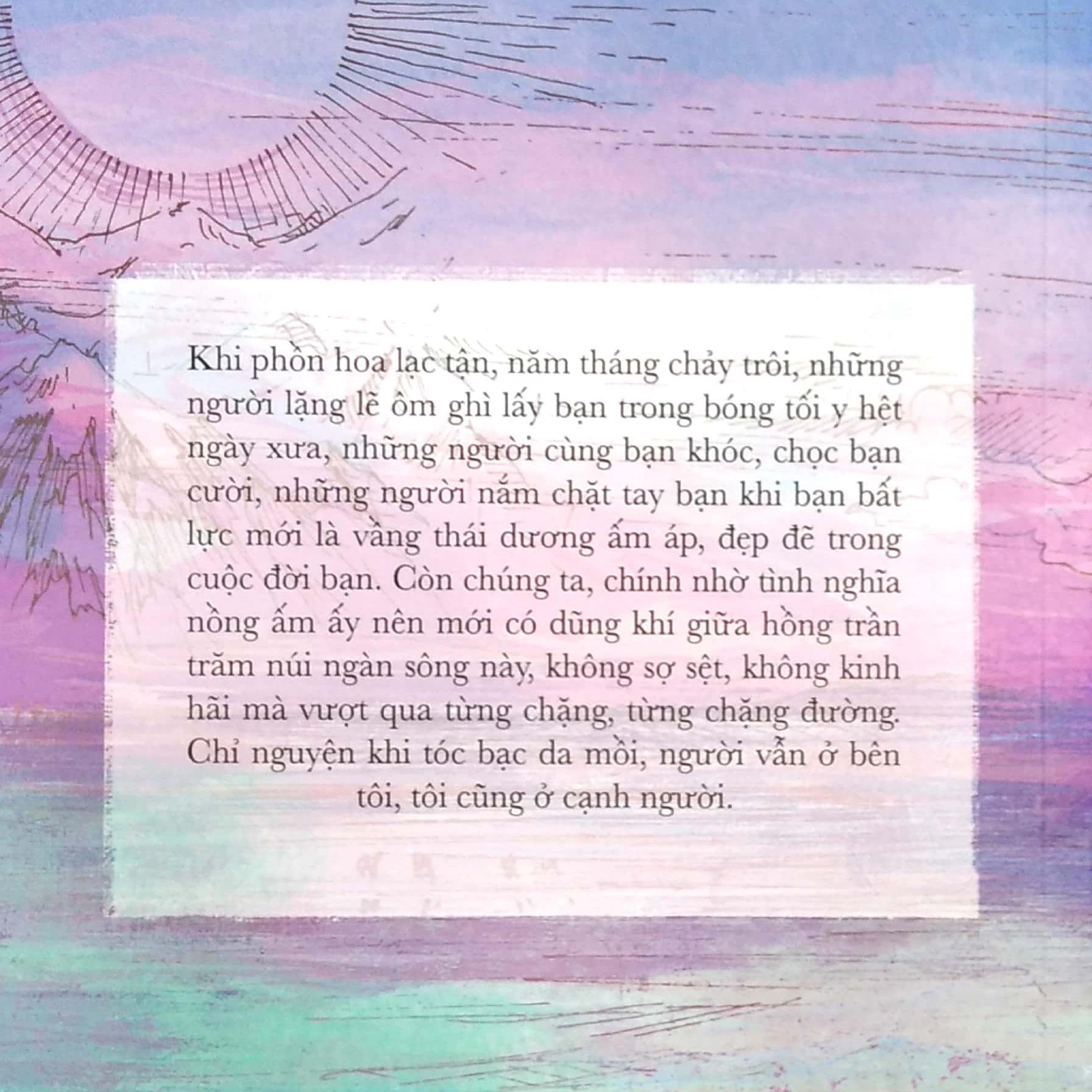 Thời Gian Bên Trái - Trần Duyên Bên Phải Đọc Thời gian bên trái, trần duyên bên phải, bạn sẽ bắt gặp mình trong câu chuyện của tác giả. Khi ở trong bất cứ mối quan hệ nào, dù là tình bạn, tình yêu, gia đình hay hôn nhân, chúng ta khó có thể tránh khỏi mâu thuẫn, tranh cãi hay tổn thương, mất mát. Nhưng qua lối hành văn, sự chia sẻ của Tô Tâm, bạn đọc sẽ cảm thấy như được lắng nghe và thấu hiểu.Đôi khi bạn không cần phải tôi luyện bản thân quá mạnh mẽ, cứng cỏi mới tránh được hết tổn thương chốn hồng trần. Đọc Thời gian bên trái, trần duyên bên phải, bạn sẽ hiểu hơn cách Tô Tâm ứng xử với đời, đặc biệt là "lấy nhu thắng cương". Mỗi câu chuyện, mỗi lời tâm tình của tác giả không mang đến cảm giác trịch thượng “dạy đời”. Cô như một người chị đã bước qua nhiều thăng trầm của cuộc sống, nhẹ nhàng khe khẽ dạy lại cho đàn em cách đối nhân xử thế, trân trọng người và yêu lấy chính mình.Khi phồn hoa lạc tận, năm tháng chảy trôi, những người lặng lẽ ôm ghì lấy bạn trong bóng tối y hệt ngày xưa, những người cùng bạn khóc, chọc bạn cười, những người nắm tay bạn khi bạn bất lực mới là vầng thái dương ấm áp, đẹp đẽ trong cuộc đời bạn. Còn chúng ta, chính nhờ tình nghĩa nồng ấm ấy nên mới có dũng khí giữa hồng trần trăm núi ngàn sông này, không sợ sệt, không kinh hãi mà vượt qua từng chặng, từng chặng đường. Chỉ nguyện khi tóc bạc da mồi, người vẫn ở bên tôi, tôi cũng ở cạnh người. Mời bạn bước vào những suy tưởng cảm nhận rất nhẹ nhàng bay bổng nhưng lại rất đời thường trong Thời Gian Bên Trái Trần Duyên Bên Phải! Tác giả: Tô Tâm, là một nữ tác giả nổi tiếng, sống ở miền Bắc Trung Quốc, tự truyền thông cho bản thân. Hăng hái nơi làm việc, yêu mến những con chữ, dù gió to có nổi, cả đời không buông lơi. Về công việc, cuộc sống, hôn nhân, phụ nữ, những điều Tô Tâm viết cũng chính là tiếng lòng của cô. 2H Books – Delivering Happiness 2H Books là công ty trực thuộc Công ty cổ phần văn hóa Huy Hoàng. Chúng tôi cung cấp các đầu sách uy tín, đã được chọn lọc trên thị trường.