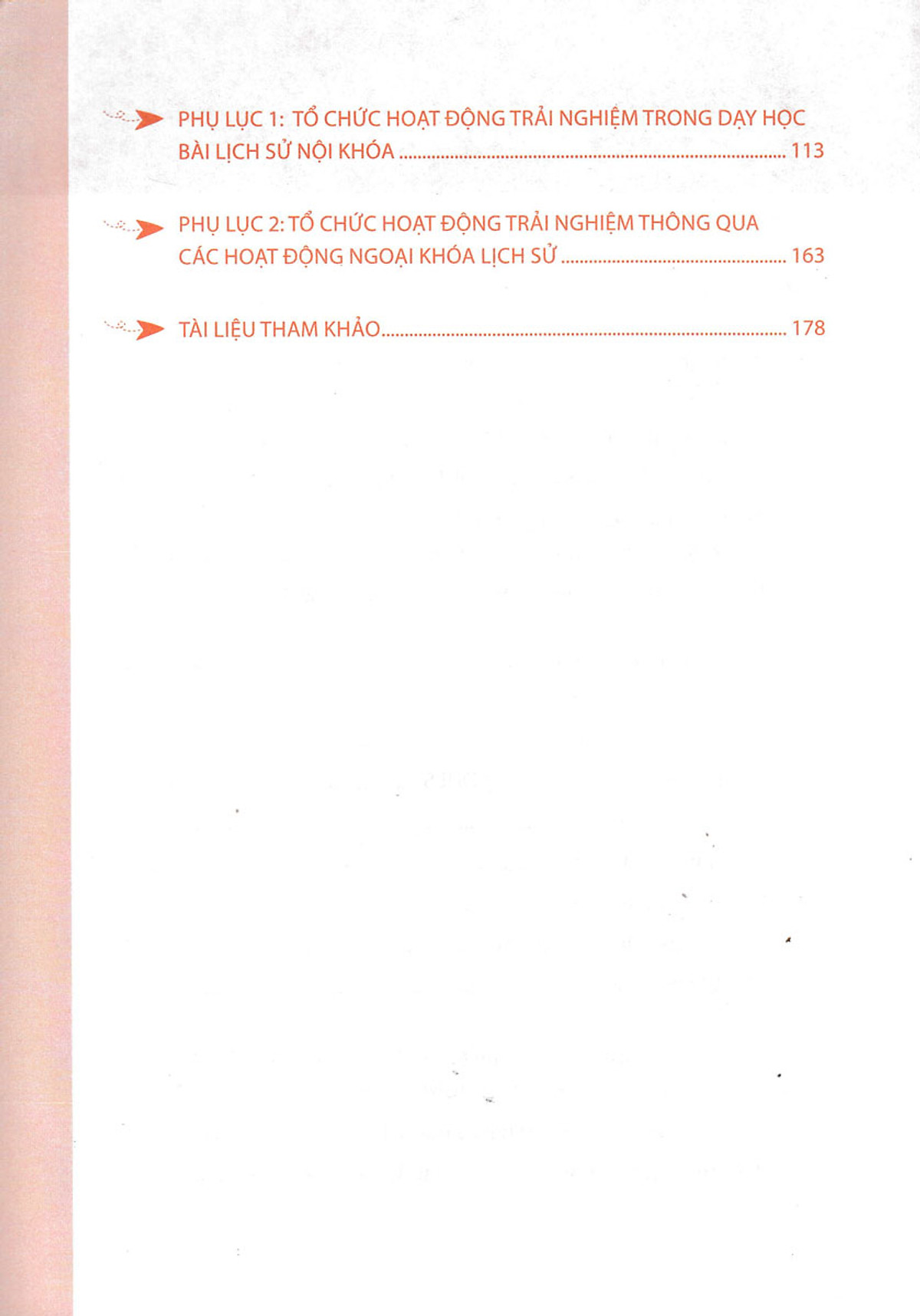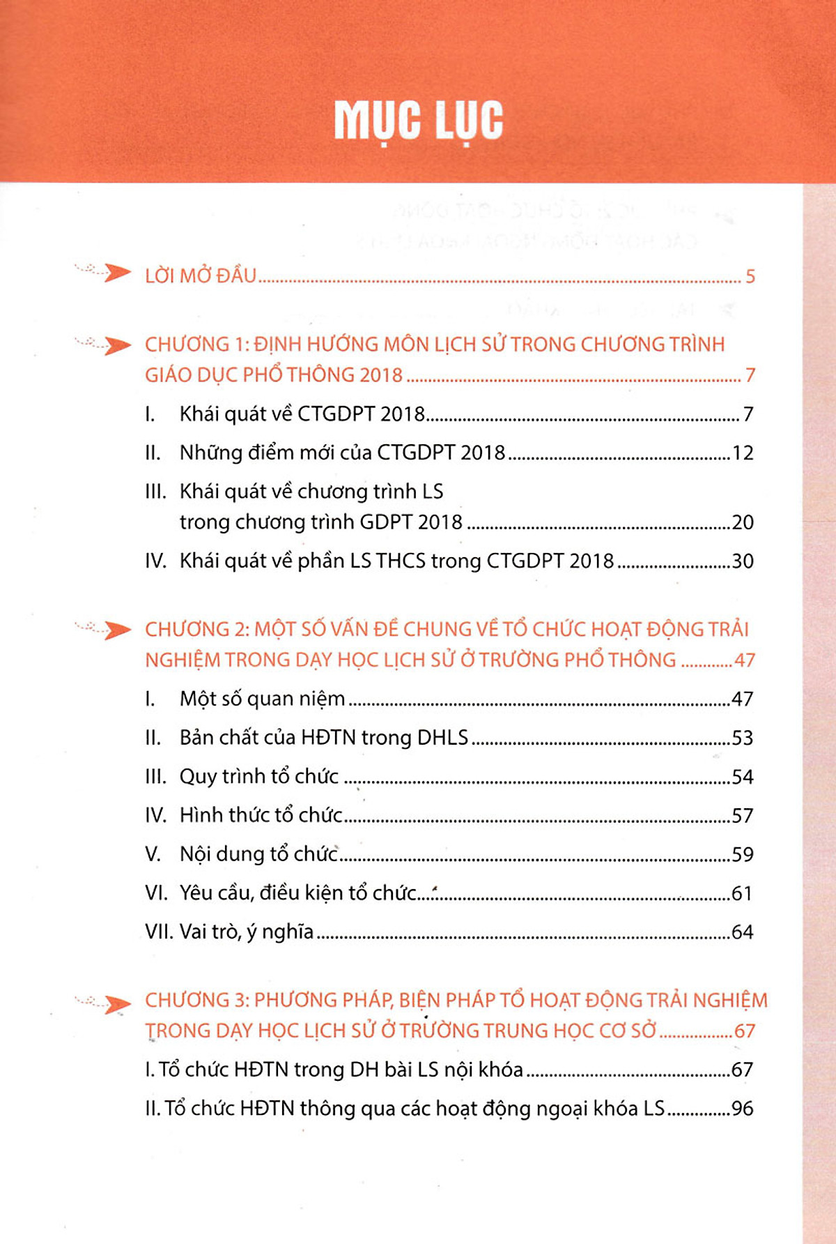 Chương 3: Phương pháp, biện pháp tổ chức hoạt động trải nghiệm trong dạy học Lịch sử ở trường phổ thông. Chương này hướng dẫn phương pháp và biện pháp tổ chức hoạt động trải nghiệm trong dạy học bài Lịch sử nội khóa và ngoại khóa. Bên cạnh phần lý thuyết, các tác giả đưa ra gợi ý một số hoạt động trải nghiệm có tính ứng dụng cao trong những bối cảnh, tình huống, chủ đề dạy học cụ thể. Qua đó, giúp người đọc dễ hình dung về cách thức khai thác hoạt động trải nghiệm trong dạy và học Lịch sử theo định hướng của chương trình, SGK mới.