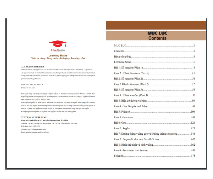 - BẢNG CÔNG THỨC: Kiểm tra và nhớ lại các công thức Toán học quan trọng theo từng chuyên đề. TỔNG HỢP CÁC KIẾN THỨC & MỤC TIÊU THEO TỪNG CHUYÊN ĐỀ: Khái quát các chủ đề trong cuốn sách và từng bước học theo các chủ đề. CÁC DẠNG BÀI TẬP THỰC HÀNH – MỞ RỘNG – NÂNG CAO: Thực hành liên tục, giải quyết các dạng toán quen dần theo các chủ đề, nâng dần mức độ từ dễ đến khó. HƯỚNG DẪN CÁCH GIẢI TỪNG BƯỚC: Tự học bằng cách học theo hướng dẫn giải ở cuối sách. ĐÁNH GIÁ NĂNG LỰC: Sau một vài chủ đề, học sinh sẽ được kiểm tra và đánh giá kết quả mức độ tiến bộ, từ những nội dung cơ bản nhất và nâng cao dần. NỘI DUNG: 80% tổng hợp đầy đủ các kiến thức trên lớp của học sinh trung học cơ sở, trình bày theo phương pháp của Singapore. 20% mở rộng kiến thức theo chương trình chuẩn quốc tế. BÀI TẬP MỞ RỘNG VÀ NÂNG CAO: Các bài luyện tập được xây dựng ở mức độ nâng cao dần, giúp trẻ làm quen với nhiều dạng bài cải thiện khả năng linh hoạt giải các các bài toán khác nhau của cùng 1 dạng. Toán Tài Năng 3A-B: Dành cho học sinh từ 8-9 tuổi. thật sự xứng đáng có trong tủ sách của các bạn học sinh lớp 3, lớp 4