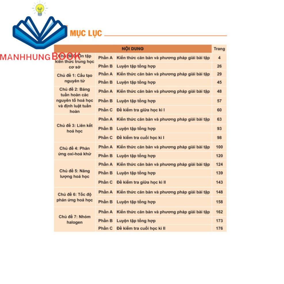 Phần 1: Tóm tắt có mở rộng và nâng cao kiến thức quan trọng của bài học theo từng chủ đề của SGK, có phân dạng và giải chi tiết bài tập tự luận và có bài tập trắc nghiệm đối với từng dạng để học sinh luyện tập. Đặc biệt với cuốn lớp 10 các tác giả đưa vào chủ đề 0: "Ôn tập kiến thức trung học cơ sở" nhằm giúp các em học sinh ôn tập lý thuyết trọng tâm, công thức tính và các dạng bài toán Hóa học cơ bản ở THCS để từ đó các em có sự tự tin khi học các chuyên đề của SGK Hóa học 10 mới