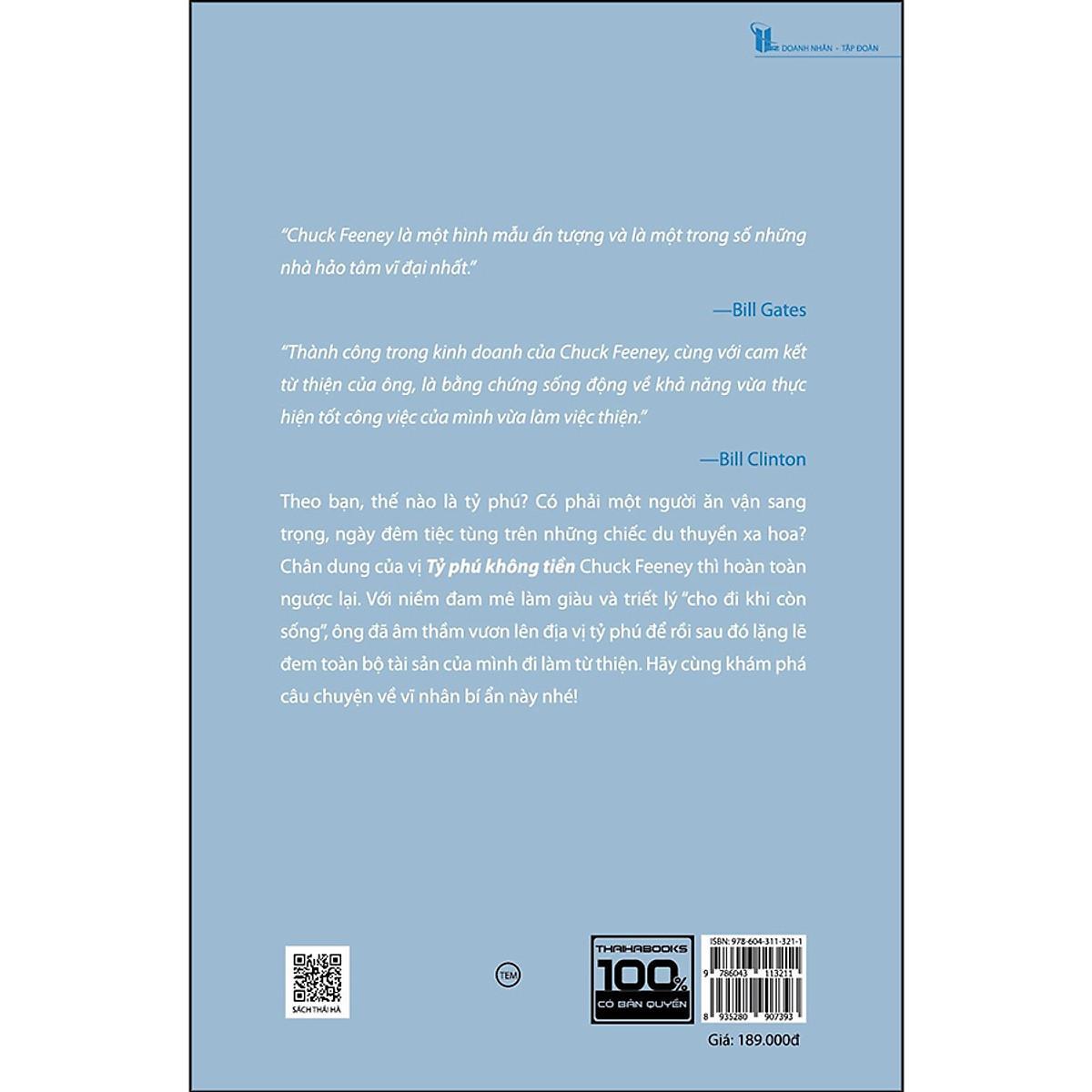 Cuốn Tỷ phú không tiền là tiểu sử về Chuck Feeney, tường thuật lại những sóng gió ông và các cộng sự trải qua trên thương trường để kiến tạo nên một đế chế bán lẻ hùng mạnh, cũng như những nỗ lực của ông trong việc đem toàn bộ gia sản đi làm từ thiện. Trong sách cũng có một chương kể về những hoạt động tài trợ của Chuck Feeney tại Việt Nam bao gồm việc hợp tác với tổ chức Đông Tây Hội Ngộ, hay tài trợ cho trường RMIT. Tác giả cũng nhấn mạnh tầm ảnh hưởng của Feeney trong việc khuyến khích các tỷ phú trên thế giới như Bill Gates và Warren Buffett cho đi khi còn sống.