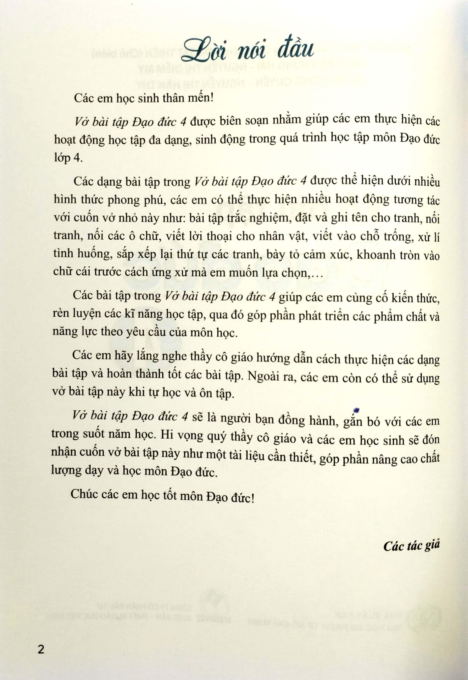 Sách giáo khoa Vở Bài Tập Đạo Đức 4 thuộc bộ sách Cánh Diều, được biên soạn dựa trên quan điểm, mục tiêu của Chương trình Giáo dục phổ thông 2018 nhằm đáp ứng yêu cầu phát triển phẩm chất và năng lực học sinh.