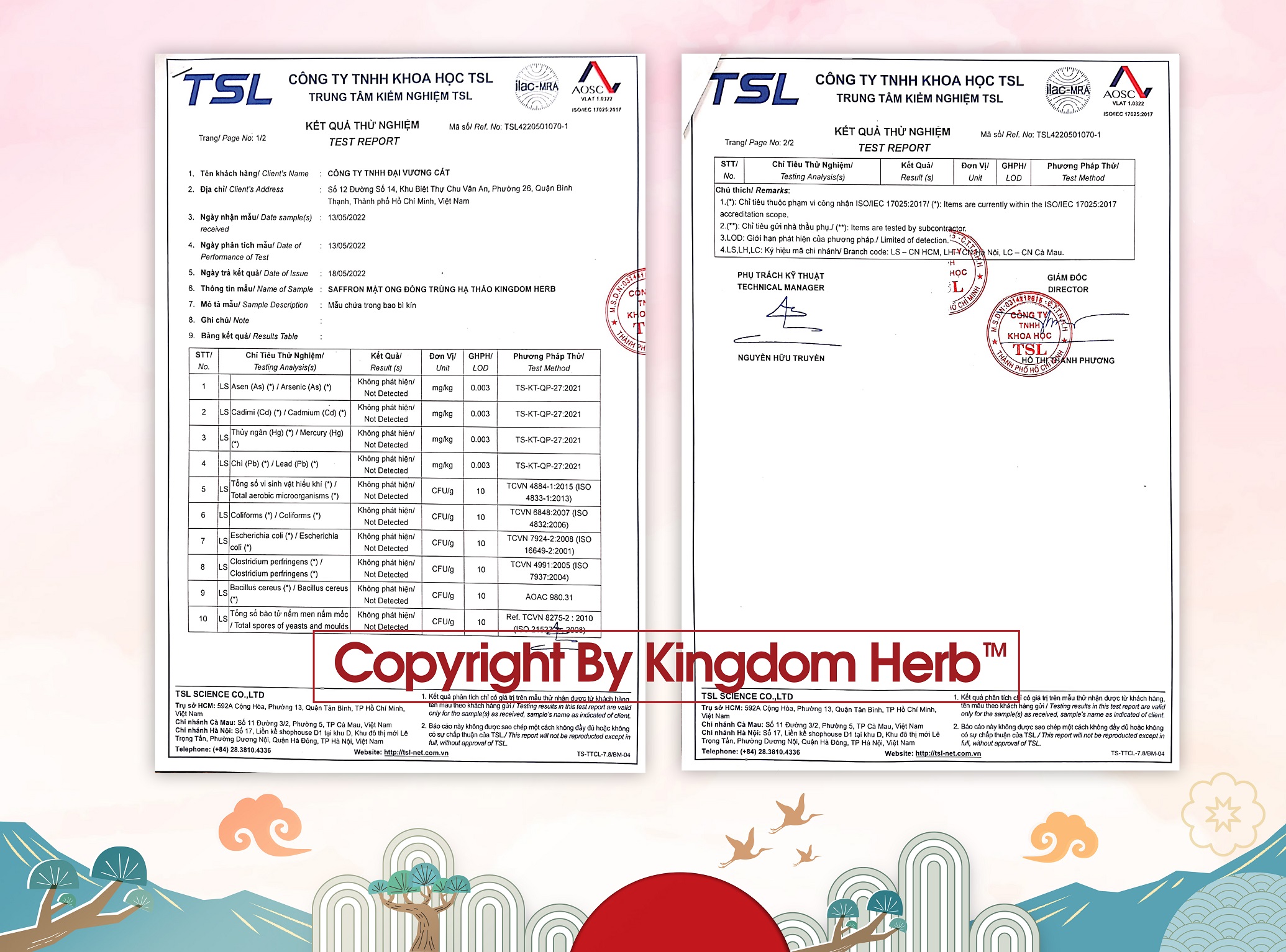 - Đông trùng hạ thảo Kingdom được chứng nhận vệ sinh an toàn thực phẩm và chứng nhận chất lượng tại trung tâm kiểm nghiệm TSL
