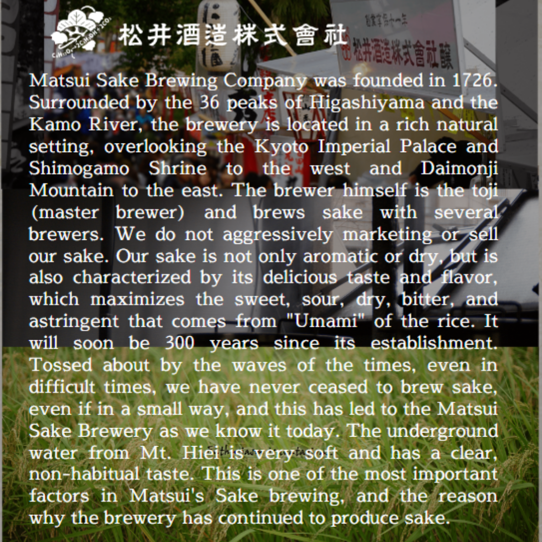 Để mang lại sự dễ dàng cho các nhà hàng ở Kyoto trong việc sử dụng r'ượu sake, nhà nấu r'ượu sake không nhấn mạnh vào nguồn gốc ra đời của sake mà hướng đến hương vị thuần túy của r'ượu Sake một cách hài hòa nhất khi kếp hợp chúng với từng món ăn của nhà hàng. Hạt gạo Ginfubuki được đánh bóng đến 65% mang lại một cảm giác ấn tượng về hương vị thuần túy nhẹ nhàng và mượt mà. Thành phần: gạo Ginfubuki và men Koji. Đánh bóng gạo: 65% Thể tích: 720ml  Độ cồn: 14% HDSD: Dùng uống trực tiếp Thông tin cảnh báo: Lưu ý độ tuổi được phép sử dụng đồ uống có cồn theo quy định; Phụ nữ có thai hoặc cho con bú không nên dùng; chú ý không để bị thương khi mở nắp chai. Bảo quản: Nơi khô ráo thoáng mát tránh ánh nắng trực tiếp. NSX & HSD: Xem trên sản phẩm. NSX: Matsui Shuzou co.,ltd. NK& PP: Công ty TNHH Starmark Viet Nam. Xuất xứ: Nhật Bản