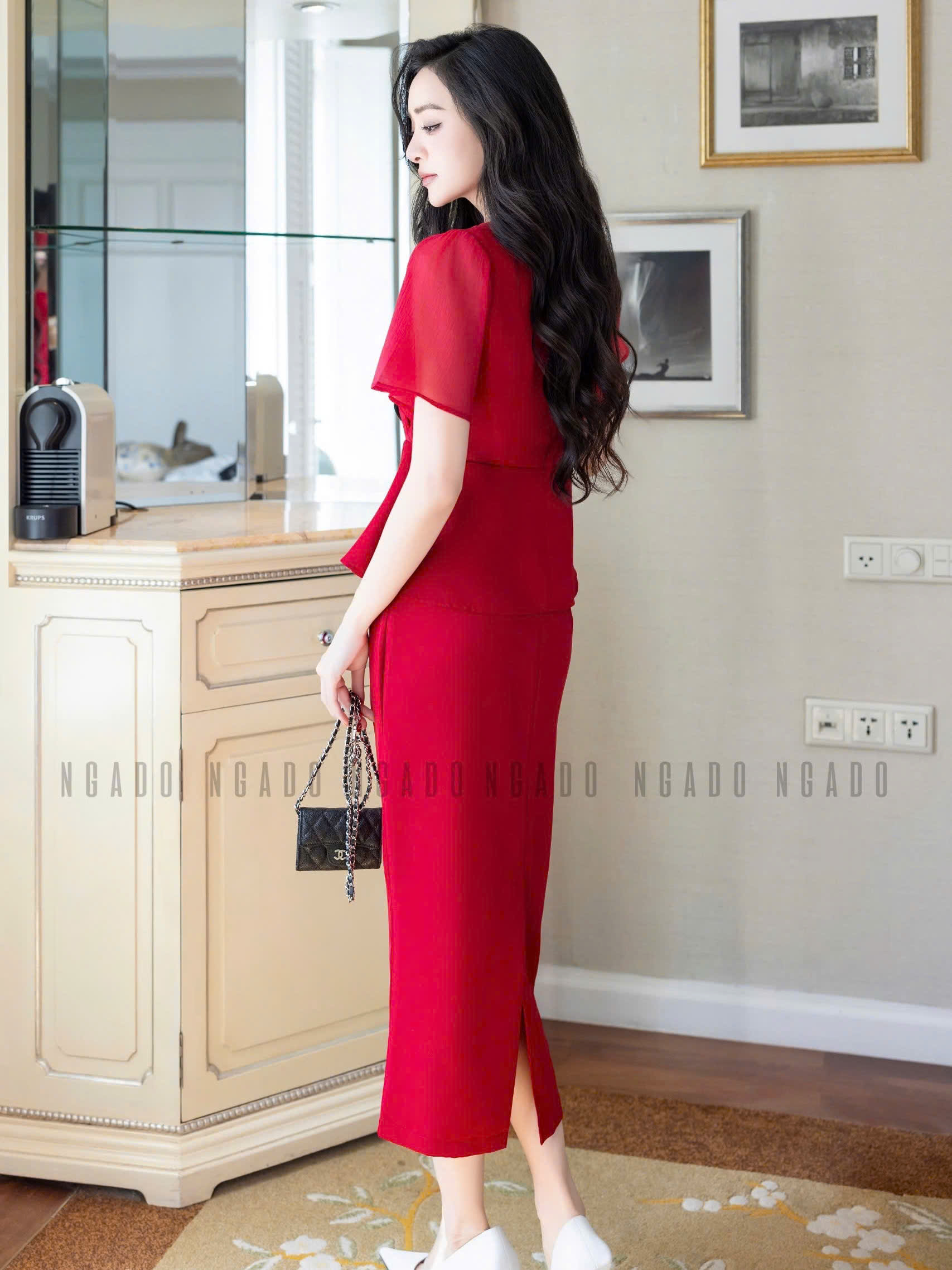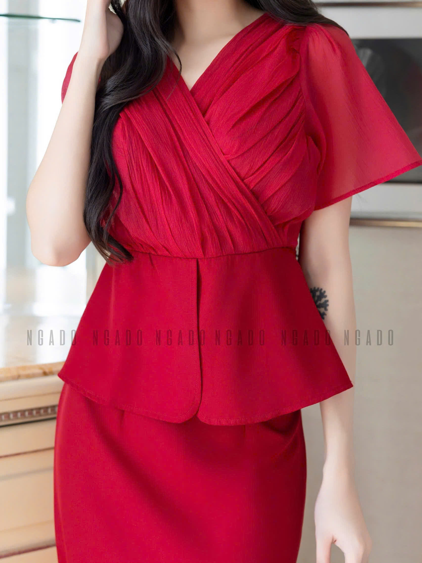 ✨Set áo váy đỏ cổ tim NGADO , Set đồ nữ , Set áo váy thiết kế