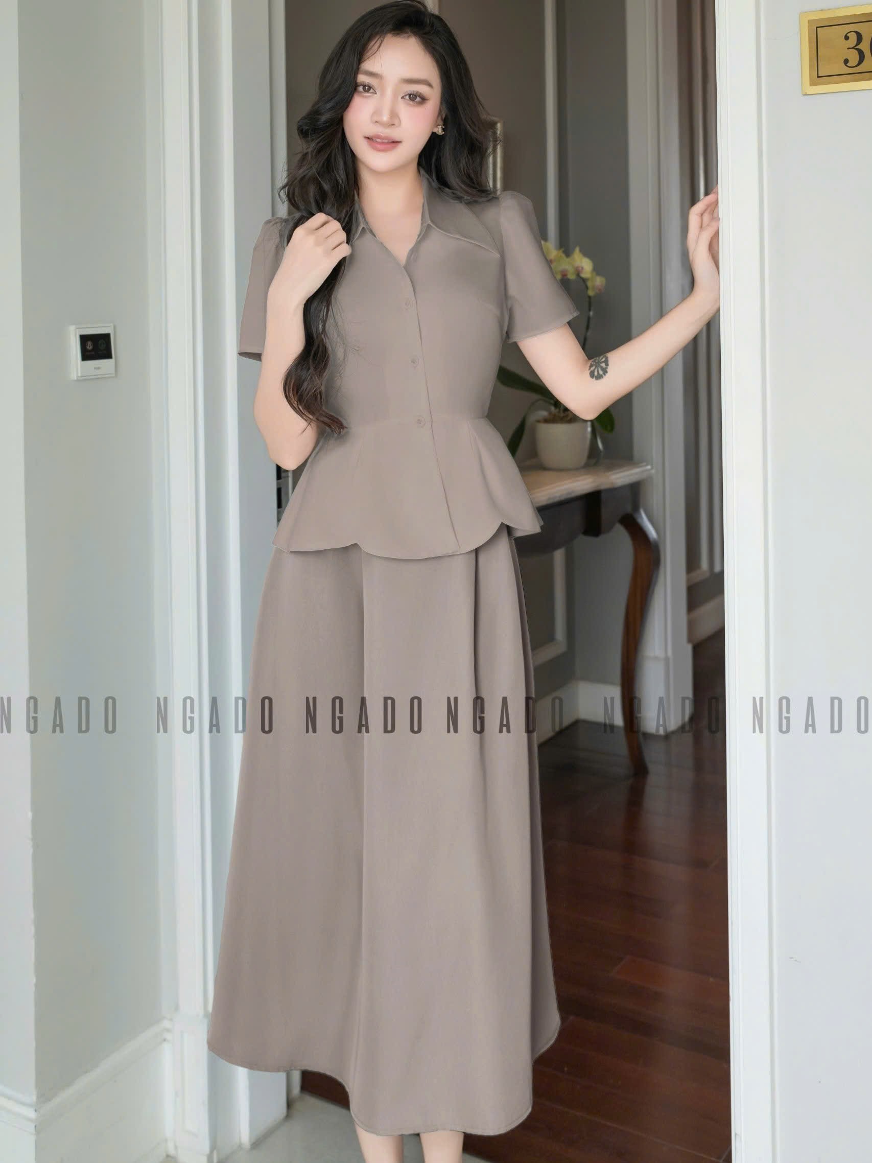 ✨Set áo váy peplum nâu NGADO , set áo váy dài , set áo váy kiểu Nữ