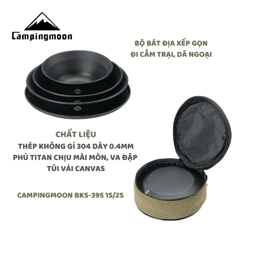 MÔ TẢ SẢN PHẨM Set bát đĩa dã ngoại cho 1, 2 người Campingmoon BKS395-1S, BKS395-2S được làm từ chất liệu Inox 304 mạ tianium đen chống ăn mòn, kháng khuẩn, tốt cho sức khỏe.