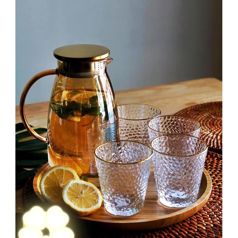 ✨Sét bình đựng nước uống thủy tinh vàng chịu nhiệt cao cấp kèm 6 cốc loe trắng viền vàng thấp vân sần kèm khay tre