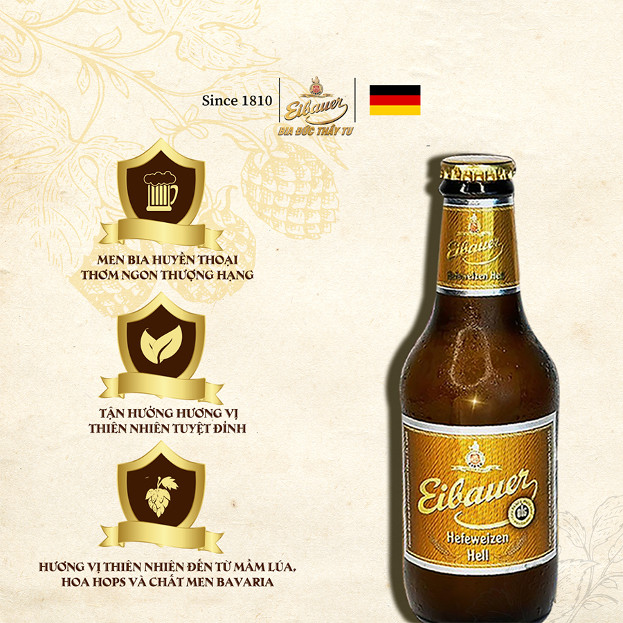 Mua tại Tiktok[SINCE 1810] Bia Đức Thầy Tu Eibauer Vàng 5.2 ĐỘ - Lên Men Tự Nhiên Thượng Hạng - Nhập Khẩu Chính Hãng Xuất xứ & Nơi sản xuất / Origin: Đức / Germany Nồng độ cồn / Alcohol content: 5.2% vol Màu sắc bia / Colour of beer: 13.6 EBC Độ đắng / Bitternes units: 15.3 BU Thành Phần : Hoa bia, mạch nha thơm, men bia sống, nước cất tinh khiết. HSD 18 tháng kể từ ngày sản xuất LỊCH SỬ BIA 200 NĂM: Năm 1810 nhà máy bia Eibauer đầu tiên được vua của Saxony – Frederick Augustus I (1806-1827), cho phép xây dựng theo công thức làm bia một vị thầy tu xứ Eibauer, người đam mê nghệ thuật ủ bia và sáng tạo ra chất bia với hương vị tuyệt đỉnh lừng danh hơn 200 năm. Bia Vàng Eibauer - 5.2% Vol : Dòng bia hoàn hảo để nuôi dưỡng cảm xúc, giải tỏa căng thẳng mệt mỏi, chỉ vài ngụm bia vàng thầy tu Eibauer cảm hứng lại tuôn trào, năng lượng lại dạt dào, nhẹ nhàng lâng lâng sảng khoái Chỉ cần so sánh với bất kỳ thức uống khác về độ cân bằng êm mượt, sự hấp dẫn của hương thơm tự nhiên, hậu vị mượt mà thuần khiết, bạn sẽ dễ dàng cảm nhận được đẳng cấp thượng hạng và hương vị tuyệt hảo của bia vàng Eibauer mà không có dòng bia nào có thể so sánh được. Vẻ đẹp thuần túy của một ly Eibauer vàng 5.2 vol. Ai đã thử thì khó lòng bỏ qua Màu sắc: sắc vàng sánh đậm đặc trưng Mùi thơm: Hương thơm mạch nha phảng phất dễ chịu bắt nguồn từ mạch nha và hoa bia vùng Hallertau. Vị : Eibauer thấm dần nhẹ nhàng qua từng ngụm khiến cho người uống ngỡ ngàng về độ mạnh mẽ một cách từ tốn, không phô trương nhưng đầy đẳng cấp. Ở những ngụm đầu tiên, một cảm giác tê nhẹ nơi đầu lưỡi, sự cân bằng mềm mại giữa vị ngọt của mạch nha và vị đắng thanh mát đặc trưng của hoa hops. Lớp bọt là các hạt mịn bồng bềnh, hài hòa trong dòng chảy sóng sánh. Bia Độc Tôn Eibauer Đức CÓ ĐIỂM GÌ KHÁC BIỆT? Men bia: Bia lên men tự nhiên lắng dưới đáy chai Bọt bia: Lớp bọt tự nhiên sánh mịn, bùi béo Cồn: Cồn được sinh ra trong quá trình lên men tự nhiên, được ủ tối thiểu 48 ngày Giá trị sức khỏe: Không gây nhức đầu, bổ sung men đường ruột Hương vị: Hương vị tự nhiên từ lúa mì, lúa mạch, hoa hốp Hướng dẫn bảo quản: Bảo quản ở nhiệt độ thường, nơi khô ráo, thoáng mát, tránh xa ánh nắng mặt trời. Bảo quản trong tủ lạnh nhiệt độ từ 9 đến 11 độ C cho có bia chất lượng bia tốt nhất. Hướng dẫn sử dụng: Bia ướp lạnh sâu, nhiệt độ lý tưởng là 10°C, màu bia sẽ chuyển từ vàng đỏ qua màu vàng chanh sóng sánh, hương quyện lại, vị đậm sâu là lúc bạn sẽ hiểu vì sao hương vị của nó lại lưu luyến lòng người đến thế. Lắc nhẹ đều lon/chai bia trước khi rót. – Không uống với đá, hương vị sẽ bị tàn phá vì nếu uống với đá, bia sẽ loãng ra, nhạt dần… rất khác với các loại bia ít hương vị, hay các loại bia sử dụng chất tạo hương, tạo vị