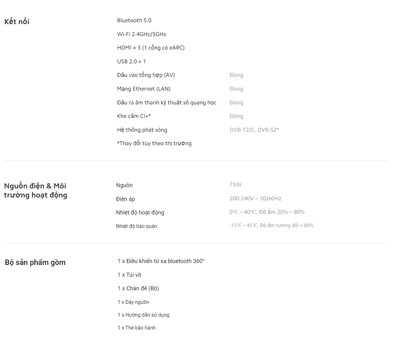 Đặc điểm nổi bật Thiết kế viền mỏng với màn hình 75 inch, mang lại trải nghiệm xem rộng rãi. Độ phân giải 4K cung cấp hình ảnh sắc nét và chân thực. HDR10 tăng