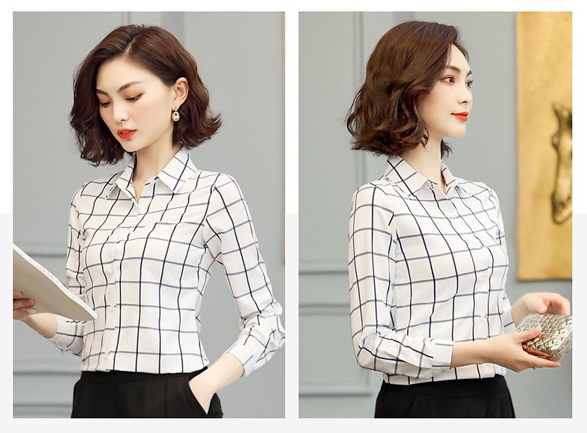- Sơ mi nữ phối caro cổ, tay công sở 150 được thiết kế thanh nhã với kiểu dáng trẻ trung - Sơ mi nữ, áo nữ được may từ chất liệu cao cấp cho