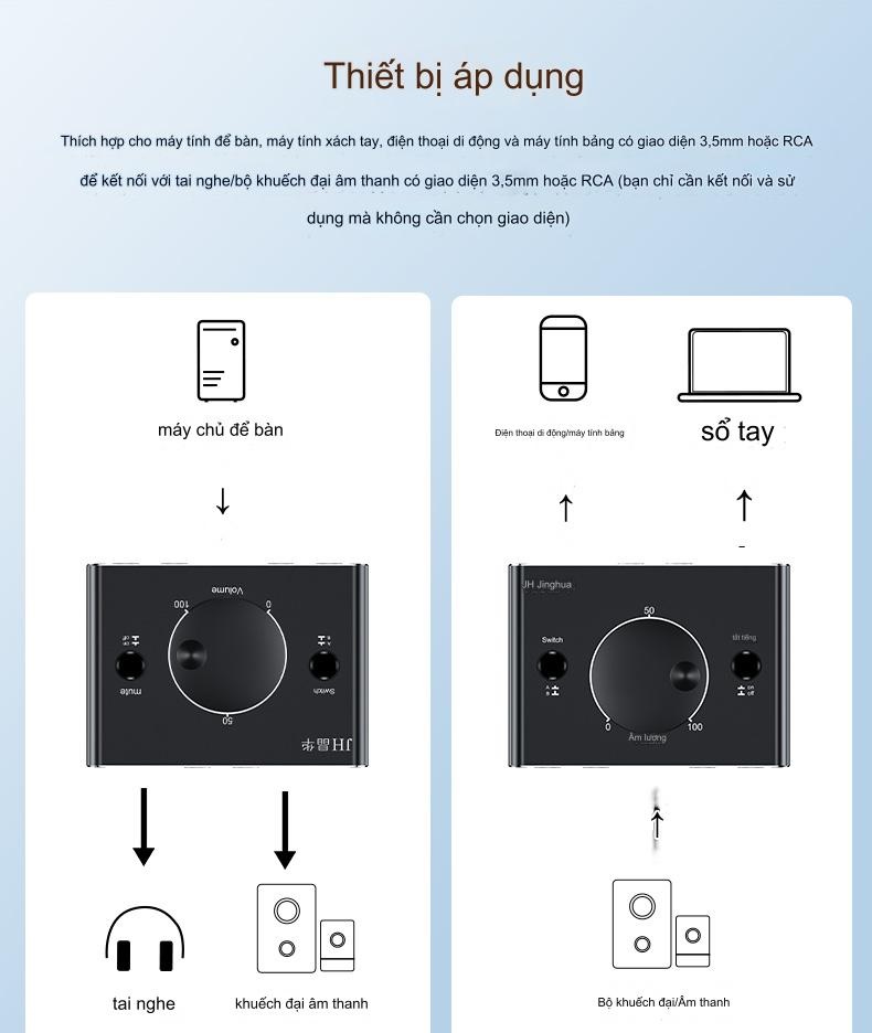 Chức năng 1: kết nối từ 1 thiết bị (dvd, pc, laptop, điện thoại) ra 2 loa, tai nghe, amply cổng 2RCA hoặc Aux 3.5mm
