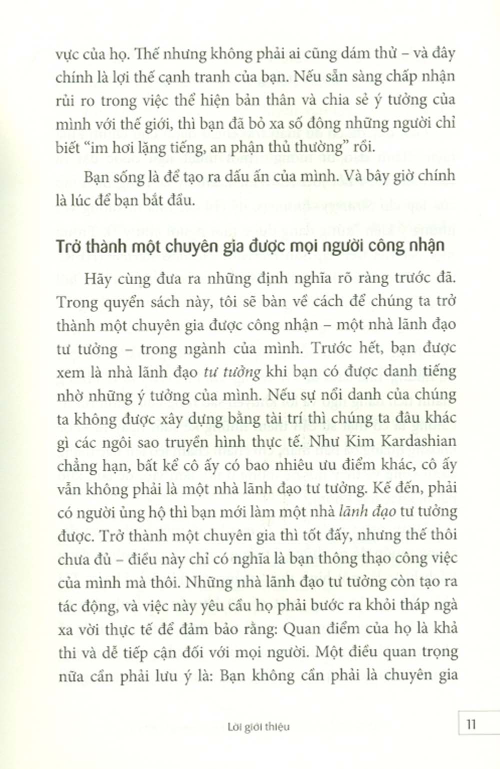 Với Dorie Clark, để trở thành một chuyên gia thực thụ, bạn cần có được danh tiếng nhờ những ý tưởng tuyệt vời của mình. Bạn đừng lo vì mình không là chuyên gia hàng đầu thế giới trong một lĩnh vực nào đó để thực hiện điều này. Bạn hoàn toàn có thể trở thành nhà lãnh đạo tư tưởng trong công ty hay cộng đồng của mình. Khi bạn đã là một nhà lãnh đạo tư tưởng thực thụ, mấu chốt vấn đề không còn là sự thăng tiến nữa mà sẽ là sự phát triển ý tưởng của chính bạn.