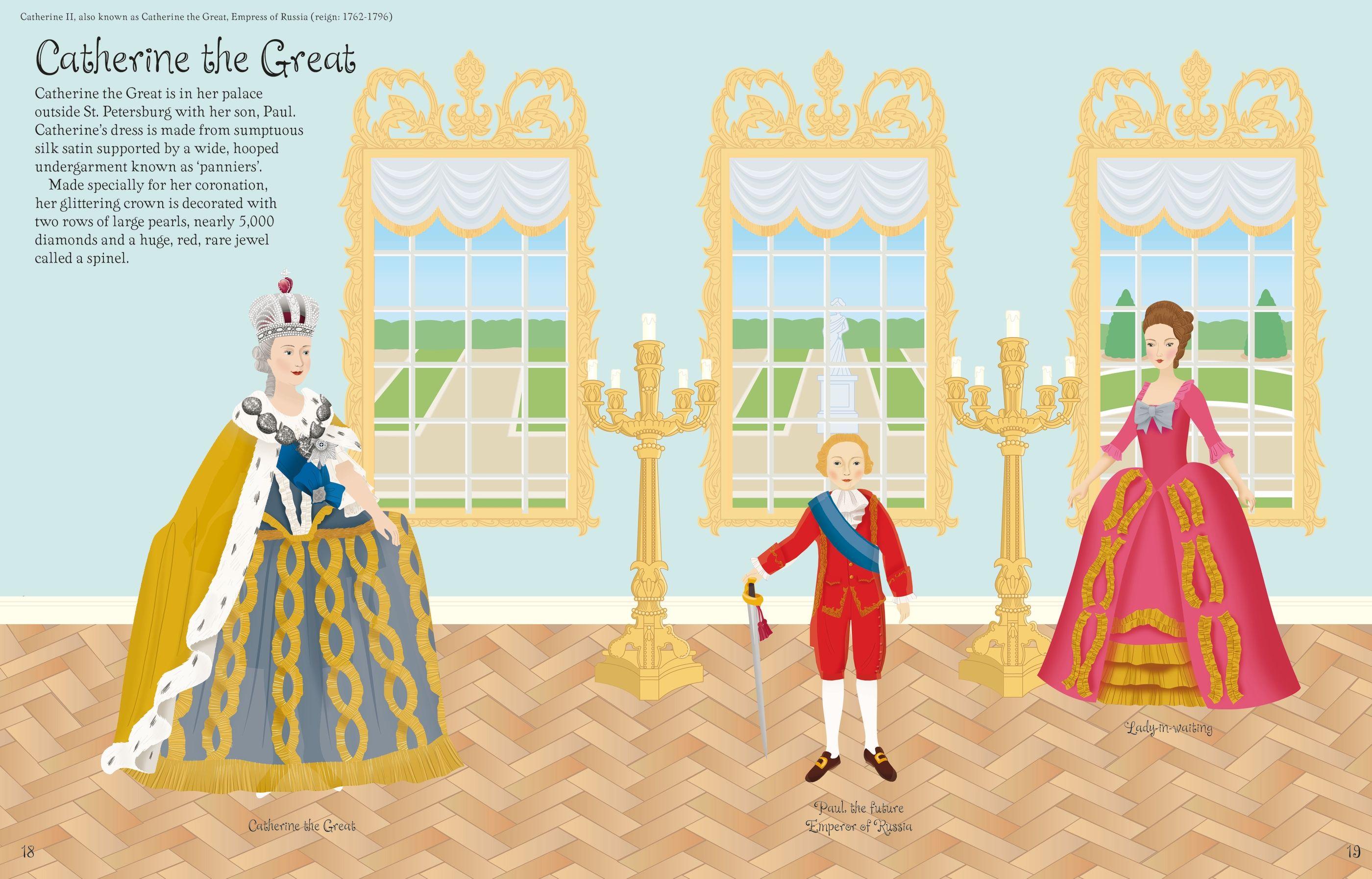A stunning sticker book packed with kings and queens through the ages, and sumptuous, historically accurate stickers to complete their outfits. Includes Queen Nefertiti, King Henry VIII, Emperor Qianlong of China, Queen Victoria, Queen Elizabeth II and lots more to dress in ceremonial robes, crowns, gowns, ruffs, hats, wigs, collars and cravats.