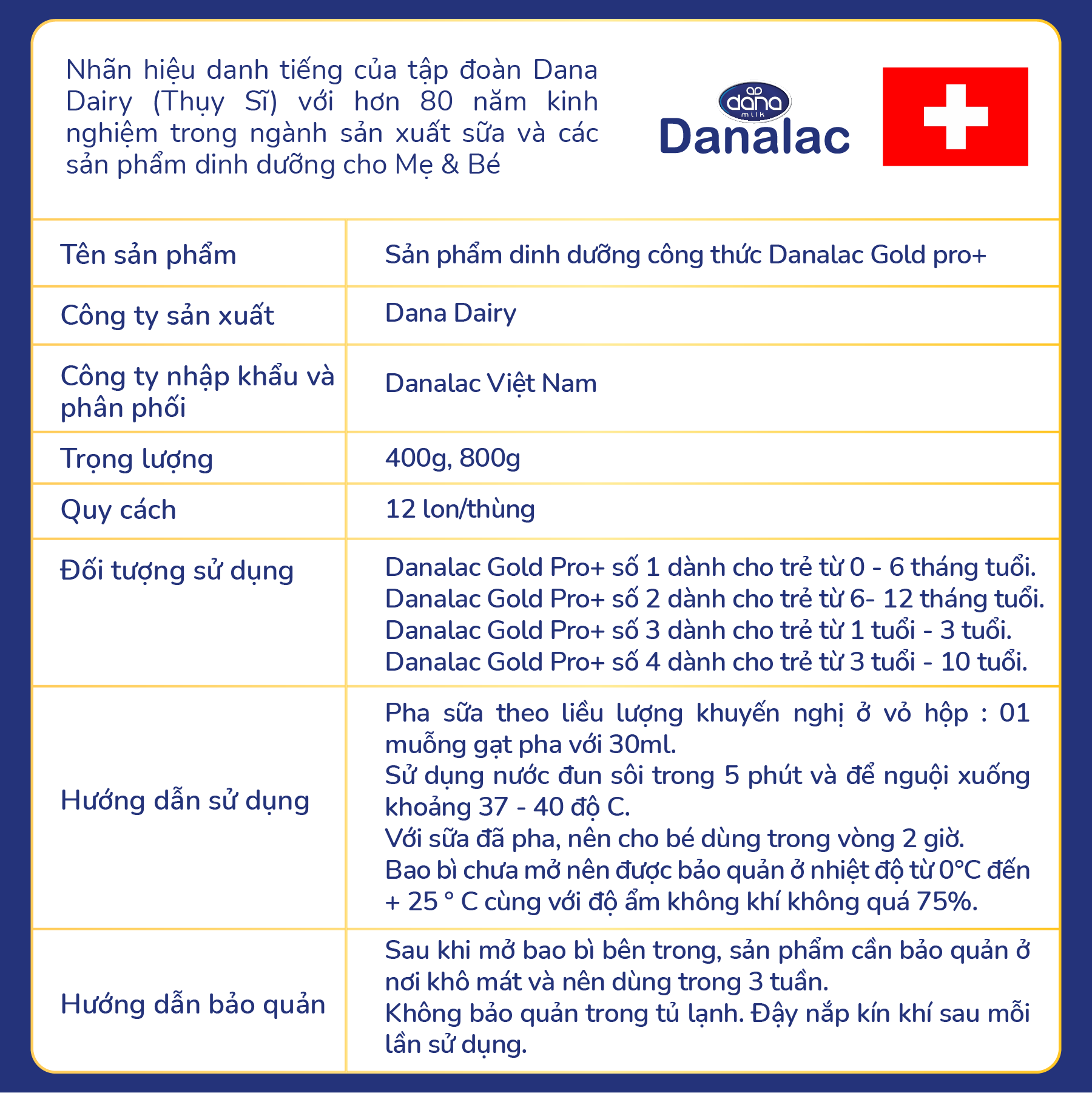 Mua tại TiktokDANALAC GOLD pro+ là nhãn hiệu sữa bột danh tiếng được phát triển bởi tập đoàn Dana Dairy (Thụy Sĩ) với hơn 80 năm kinh nghiệm trong lĩnh vực sản xuất các sản phẩm dinh dưỡng cho trẻ sơ sinh và trẻ nhỏ. THÔNG TIN SẢN PHẨM