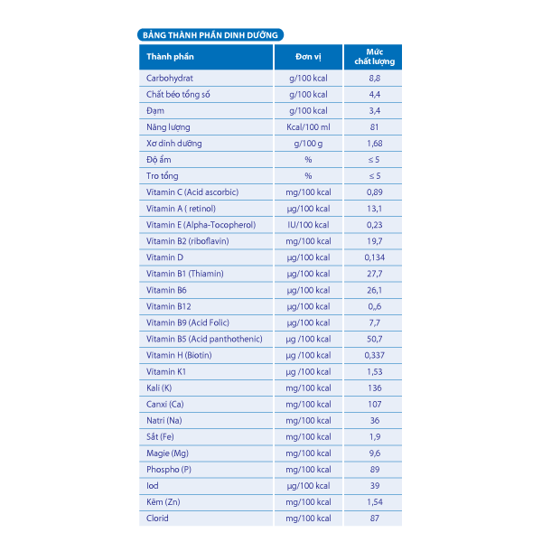 THÀNH PHẦN: Sữa bột nguyên kem bổ sung Vitamin A và D3, bột sữa (bột sữa tách béo, hỗn hợp dầu thực vật (dầu cọ, dầu bắp, dầu hạt cải, dầu hướng dương), glucose syrup,