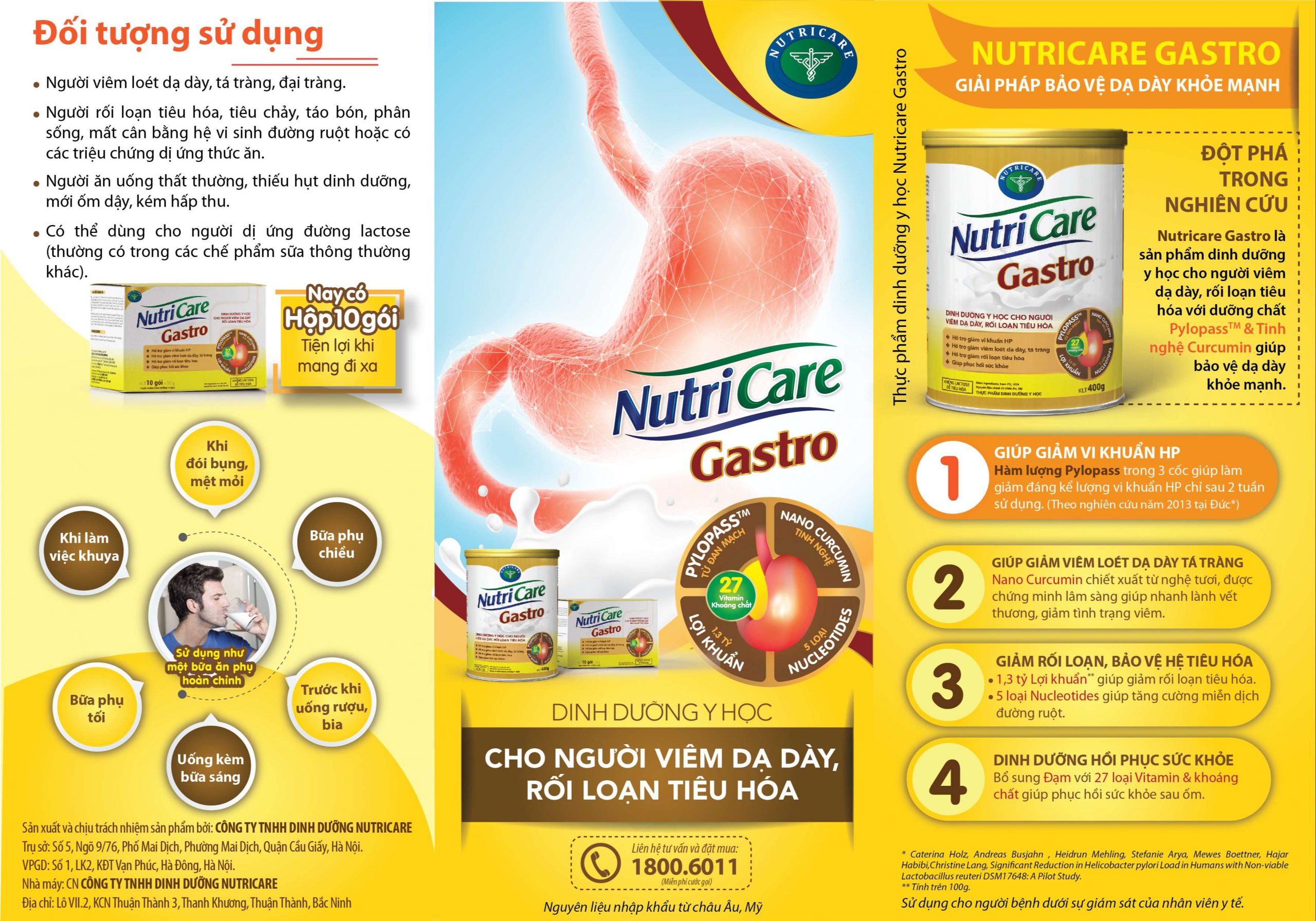 Giới thiệu Sữa Nutricare Gastro là sản phẩm dinh dưỡng y học cho người viêm dạ dày, rối loạn tiêu hóa với dưỡng chất Pylopass và Tinh nghệ curcumin giúp bảo vệ dạ dày toàn diện. Cứ 10 người thì có 1 người mắc bệnh dạ dày với các biểu hiện: Đau bụng vùng thượng vị, đau lúc đói hoặc sau ăn, ợ hơi, ợ chua, đầy đụng, buồn nôn, trào ngược. Nguyên nhân gây viêm loét dạ dày là do ăn uống không điều độ, do dùng kháng sinh, do rượu bia , do làm việc căng thẳng. và 85% nguyên nhân hàng đầu là do vi khuẩn HP (Helicobacter pylori) Rối loạn tiêu hóa, viêm loét dạ dày, tá tràng hiện nay ngày càng phổ biến, gây ảnh hưởng tới chất lượng cuộc sống và cần một chế dộ dinh dưỡng chuyên biệt., Theo các chuyên gia, phần lớn nguyên nhân đến từ Vi khuẩn HP (Helicobacter Pylori) và sự mất cân bằng hệ men vi sinh đường ruột.Tiên phong trong nghiên cứu, Nutricare Gastro là sản phẩm chuyên biệt cho người gặp vấn đề về tiêu hóa, đột phá với PylopassTM 7 Tinh nghệ Curcumin giúp giảm tình trạng viêm loét dạ đay, tá tràng. Có thể sử dụng trước hoặc sau khi uống rượu bia để bảo vệ hệ tiêu hóa khỏe mạnh. Sản phẩm của công ty Nutricare- Thương hiệu Quốc Gia về Dinh dưỡng Y học. Nutricare Gastro giải pháp bảo vệ dạ dày toàn diện Nutricare Gastro là sản phẩm dinh dưỡng y học cho người viêm dạ dày, rối loạn tiêu hóa với dưỡng chất Pylopass và Tinh nghệ curcumin giúp bảo vệ dạ dày toàn diện. Dưỡng chất Pylopass đột phá khoa học được sản xuất tại Đan Mạch giúp gắn kết và thải trừ vi khuẩn HP một cách tự nhiên và đặc biệt không có tính kháng như kháng sinh nên mang lại hiệu quả cao. Hiện nay Pylopass đã được sử dụng rộng rãi tại hơn 50 quốc gia để  bệnh Viêm loét dạ dày, phòng chống ung thư dạ dày. Công dụng của Nutricare Gastro đối với người bệnh dạ dày HỖ TRỢ GIẢM VIÊM LOÉT DẠ DÀY, TÁ TRÀNG Công thức đột phá với PylopassTM được phát triển bởi tập đoàn NOVOZYME Đan Mạch giúp đào thải vi khuẩn HP.Cùng tinh chất nghệ Nano Curcumin đã được chứng minh lâm sàng giúp nhanh lành vết thương, giảm tình trạng viêm loét dạ dày, tá tràng. Giàu Sắt &Axit Folic giúp giảm nguy cơ thiếu máu ở người bệnh. HỖ TRỢ PHỤC HỒI NIÊM MẠC RUỘT 5 loại Nucleotides giúp làm lành hệ vi nhung mao đường ruột, cần bằng hệ men vi sinh giúp phục hồi niêm mạc, tăng cường miễn dịch ruột. HỖ TRỢ GIẢM RỐI LOẠN TIÊU HÓA Bổ sung tới 1,3 tỷ lợi khuẩn Probiotic cùng 100% chất xơ hòa tan (FOS/Inulin) và hệ Vitamin nhóm B giúp hỗ trợ hệ tiêu hóa, ăn ngon miệng, giảm táo bón. Đặc biệt không chứa Lastose giúp giảm tình trạng khó chịu, tiêu chảy ở người bất dung nạp đường Lastose khi uống các chế phẩm từ sữa thông thường. GIÀU DINH DƯỠNG, PHỤC HỒI SỨC KHỎE Bổ dưỡng với nguồn dinh dưỡng giàu Đạm, cung cấp tới 27 loại vitamin & khoáng chất thiết yếu giúp tăng cường miễn dịch, phục hồi sức khỏe sau ốm. Bổ sung Canxi & Vitamin D3 cùng Megiee, Phốtpho giúp cải thiện chức năng xương khớp, tăng cường vận động. Thành phần dinh dưỡng