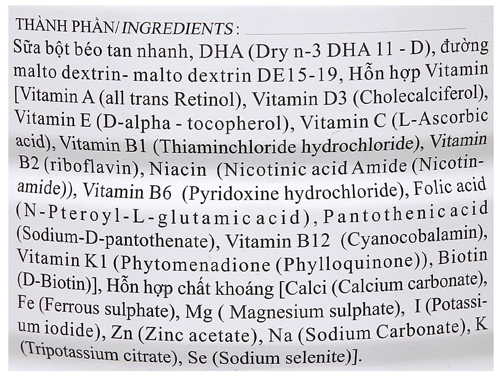 1. Thành phần: Sữa bột, Whey protein, Soy protein, Maltodextrin, Sữa non, L-Lysine HCL, FOS, Canxi Nano, Taurine, Choline, DHA, ARA, Vitamin (Vitamin A, Vitamin C, Vitamin D, Vitamin E, Vitamin D3, Vitamin K2,