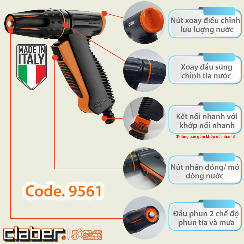 ✨Súng Tưới Cây Đa Năng Claber Precision 9561, kết nối nhanh, chỉnh được áp lực nước, phun nước 2 chế độ, có khóa rảnh tay