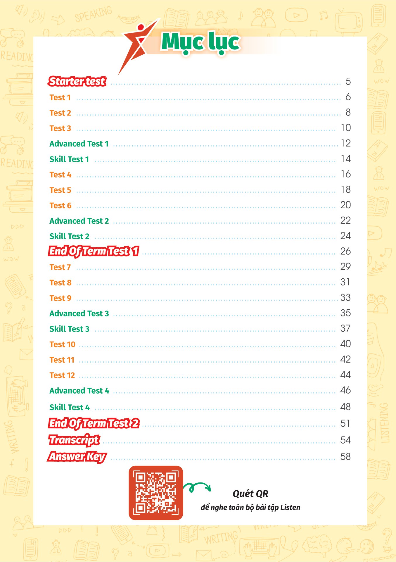 - Đối với các bài kiểm tra cuối kì (End Of Term Test): 1 bài kiểm tra về Từ vựng, 1 bài Ngữ âm, 2 bài kiểm tra kĩ năng Nghe và 2 bài kiểm trakĩ năng Đọc – Viết, 1 bài kiểm tra kĩ năng Nói. Điểm đặc biệt của cuốn sách là tính hiện đại và sự tiện dụng khi các em không cần sử dụng CD để có được bài nghe. Bộ sách tích hợp mã QR code giúp các em dễ dàng nghe file trên điện thoại.