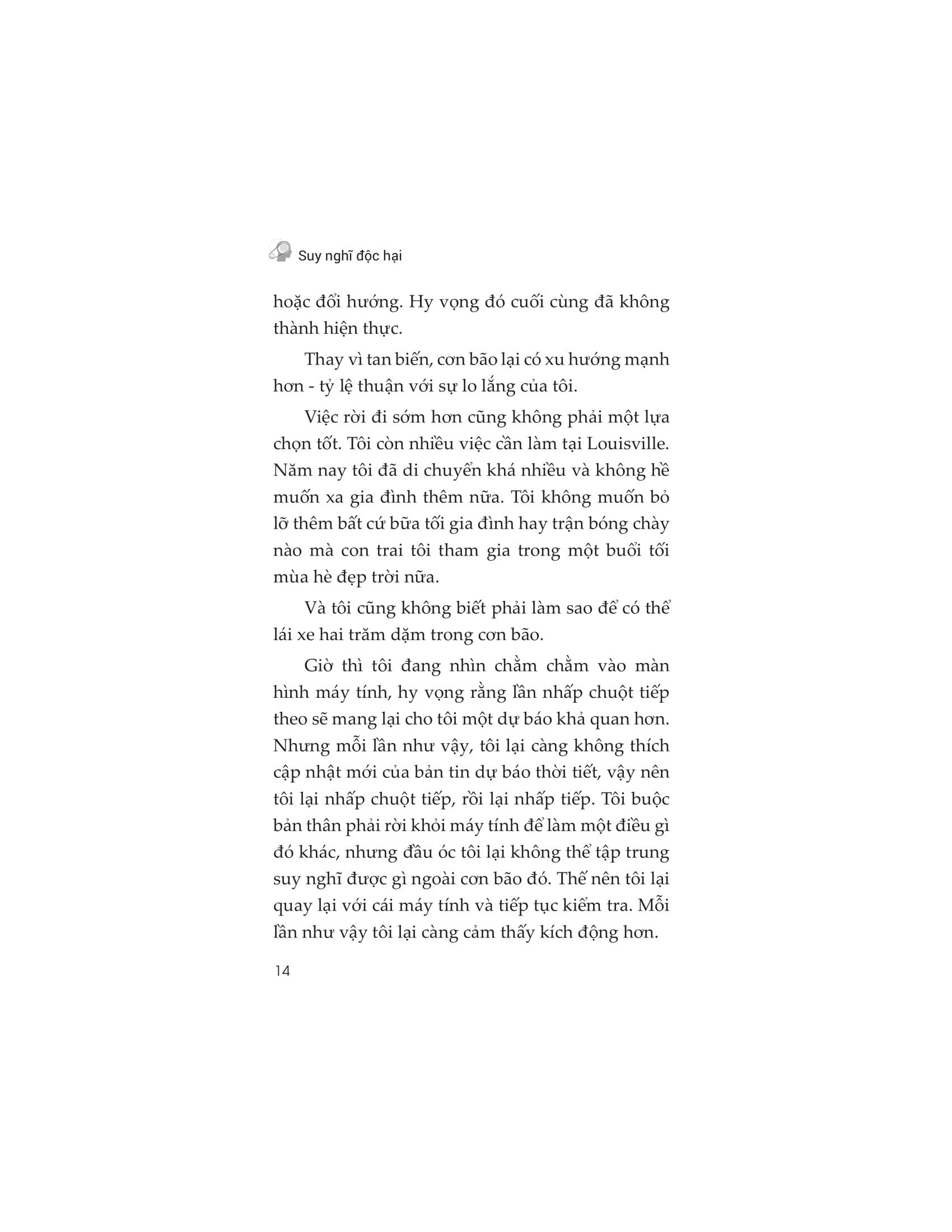 thể xảy ra trong tương lai. Việc cứ nghĩ ngợi quanh đi quẩn lại làm chúng ta cảm thấy không thoải mái chút nào, nhưng nếu không có những nguyên tắc hoặc triết lý nhất quán hướng dẫn, chúng ta dường như không thể tự cứu rỗi chính mình. Dù những mối bận tâm của bạn lớn hay nhỏ thì chúng đều có điểm chung: những suy nghĩ đó lặp đi lặp lại, không hề lành mạnh và hết sức vô ích.