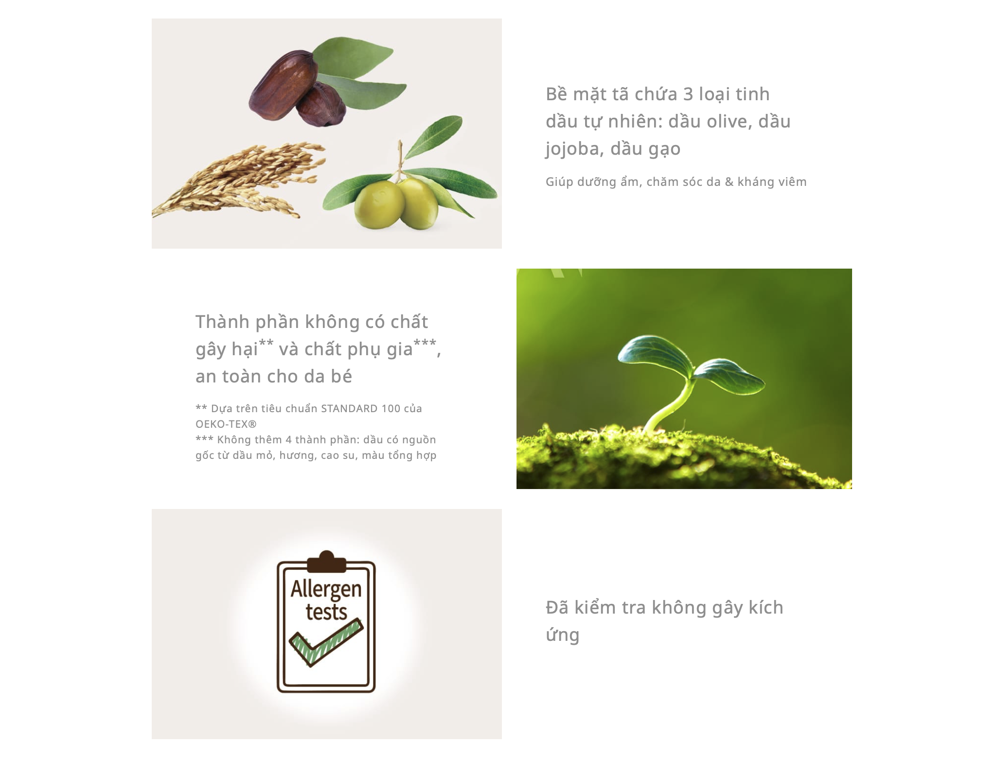 - Bề mặt tã mềm mịn, bổ sung 3 loại tinh dầu thiên nhiên: Dầu Olive, dầu Jojoba, dầu Gạo có tác dụng chăm sóc da, kháng viêm, ngăn ngừa hăm tã.