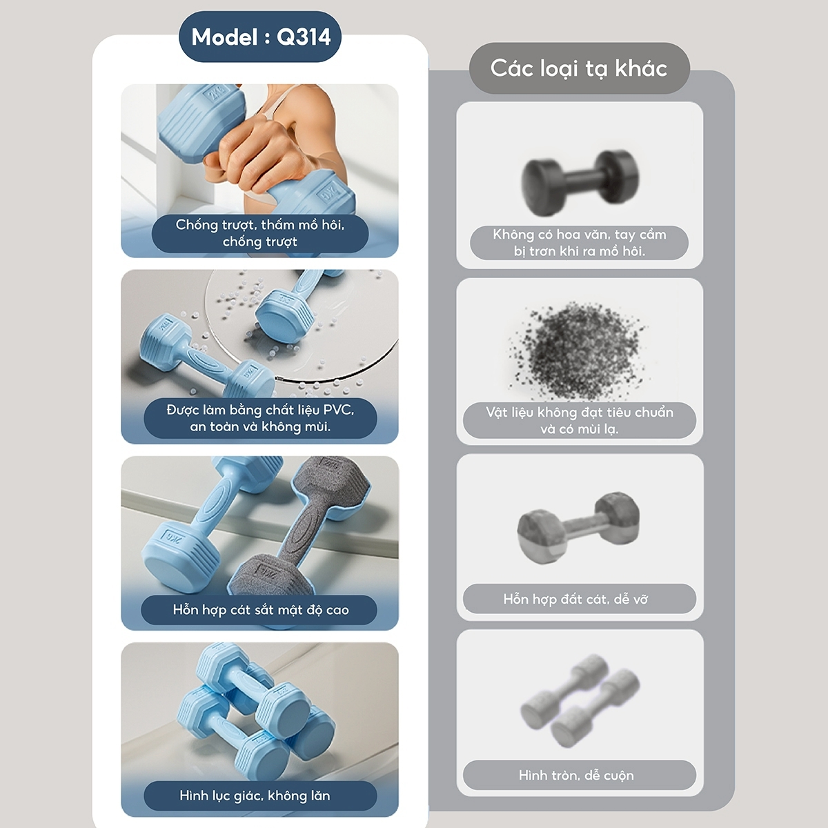 • Phần tay tạ và quả tạ đúc liền khối, đảm bảo chắc chắn và an toàn khi tập.