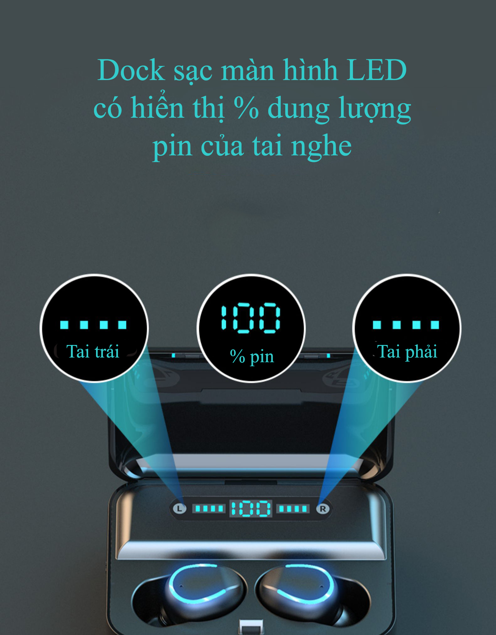 - Màn hinh LED hiển thị % pin của tai nghe