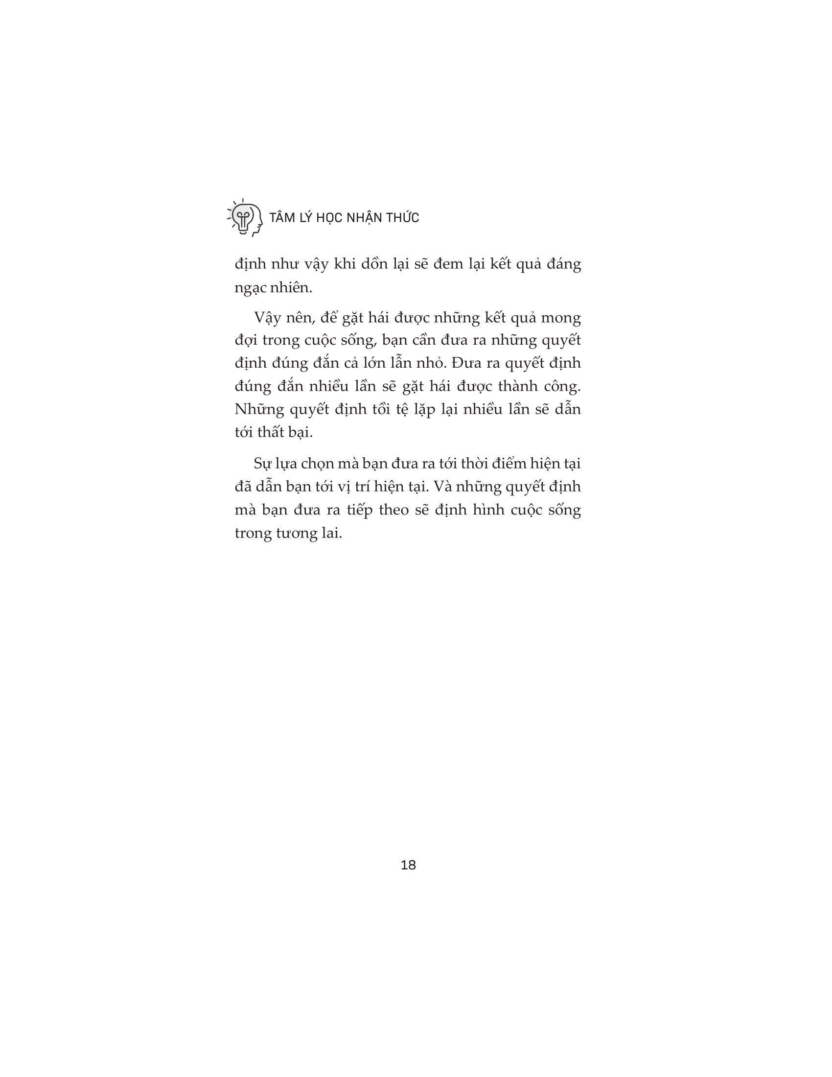 Nguyên nhân của tất cả những vấn đề được kể trên là vì thiếu kỹ năng ra quyết định. Chúng ta thiếu nhận thức về sự tác động của tâm trí và cảm xúc đến khả năng phân tích, tư duy logic và ra quyết định sáng suốt của chúng ta. May mắn là bạn có thể khiến não bộ rèn luyện khả năng tư duy theo phương thức mới hiệu quả hơn, nhận thức các yếu tố tâm lý tác động đến lựa chọn của chúng ta hay những sai lầm trong tư duy thường có. Và trong “Tâm lý học nhận thức”, tác giả sẽ chỉ ra cho bạn thấy phương thức thực hiện một cách chính xác. Kết nối tâm trí, kiểm soát cảm xúc và nỗ lực phát triển bản thân, qua từng ngày, bạn sẽ cải thiện lối tư duy, đưa ra những quyết định đúng đắn hơn, thông minh hơn và từng chút cân bằng cuộc sống.