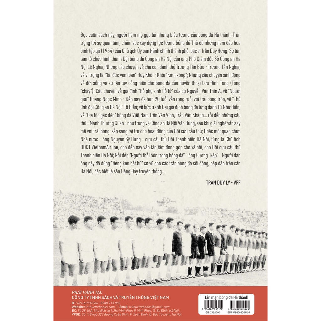 Tác giả: Hồ Công Thiết Nhà phát hành: công ty tnhh sách và truyền thông việt nam Nhà xuất bản: Nxb. Thông tin và Truyền thông Ngày phát hành: 10/2022   Số trang: 308   GIỚI THIỆU Bóng đá, từ lâu đã không còn đơn thuần chỉ là một môn thể thao để rèn luyện sức khỏe, một trò chơi để tìm kiếm niềm vui. Sự hồi hộp, phấn khích của môn thể thao này mang lại đã không chỉ làm say lòng hàng triệu người qua nhiều thế hệ, để nó được tụng xưng là môn thể thao vua, mà nó còn trở thành đam mê, là bầu máu nóng, giần giật chảy trong huyết quản của mỗi người hâm mộ thể thao trên toàn thế giới. Từ năm 1896, bóng đá lần đầu bén duyên với mảnh đất hình chữ S và dần dần chiếm được cảm tình của người dân Việt Nam. Và ngay trên mảnh đất Hà thành ngàn năm văn hiến, bóng đá cũng chiếm được một vị thế nhất định. Những đội bóng đầu tiên xuất hiện, xuất thân từ tầng lớp bình dân, mang bóng đá đến gần với người hâm mộ, đốt cháy ngọn lửa đam mê trên sân cỏ. Bóng đá Hà thành cũng có cho riêng mình một bề dày lịch sử, một con đường phát triển qua các thời kỳ. Các đội bóng như Thể công, Công an Hà Nội, Tổng cục đường sắt, Quân khu Thủ đô… được nhiều người hâm mộ nhớ đến. Những chân sút, huấn luyện viên, bình luận viên… và cả những cổ động viên tâm huyết của bóng đá Hà thành đã phần nào được ghi lại trong cuốn sách Tản mạn bóng đá Hà thành. Tản mạn về cả một quãng đường có vui, có gian khổ nhưng luôn hết lòng vì đam mê, vì tình yêu dành cho bóng đá.