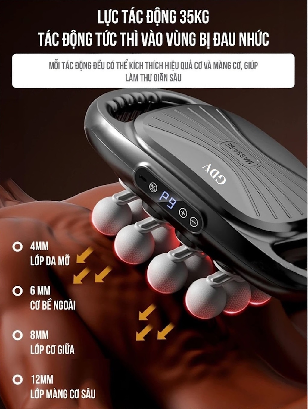 • Máy có 9 chế độ với 9 mức độ điều chỉnh thích hợp theo cơ của từng bộ phận khác nhau.