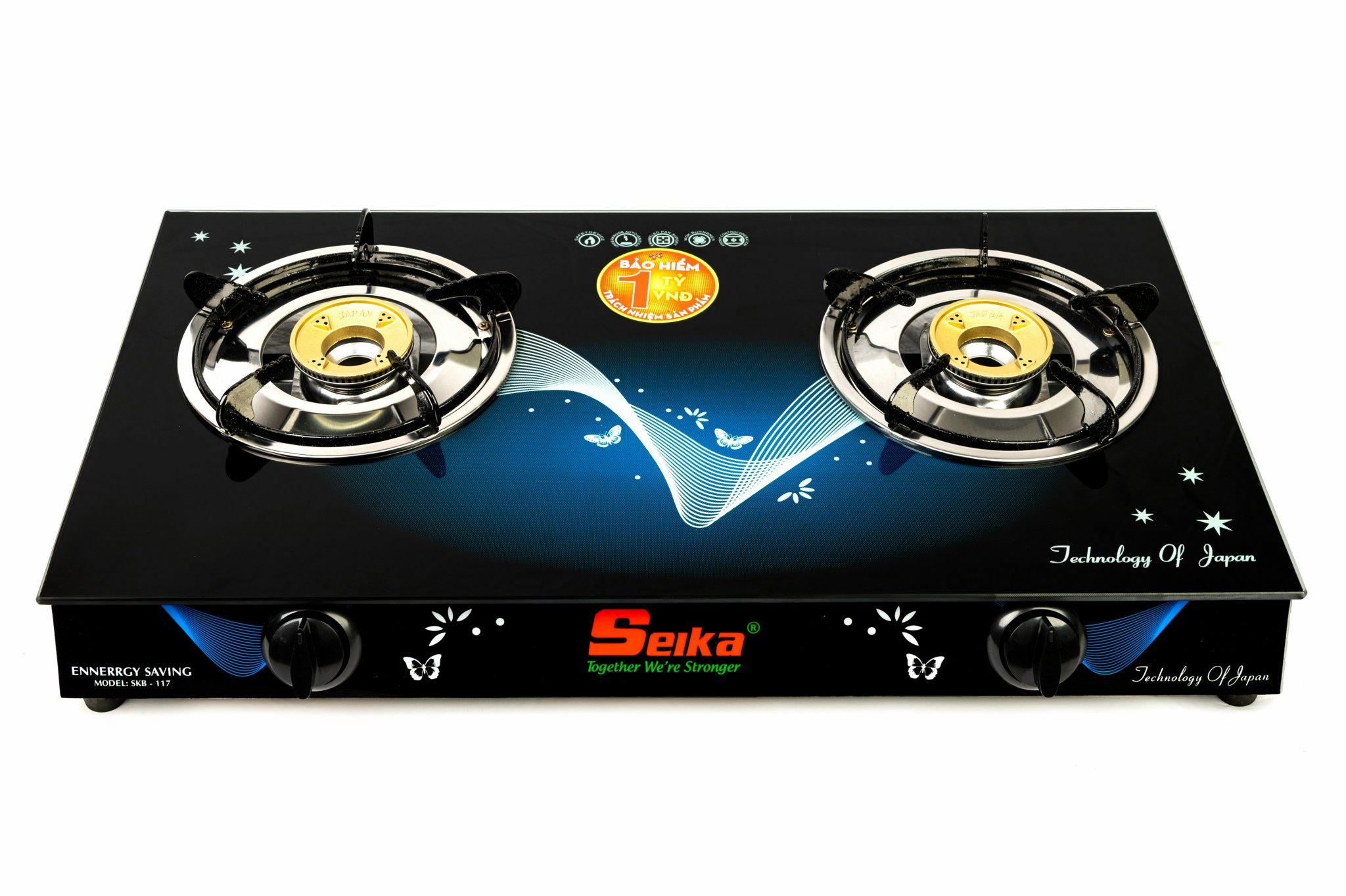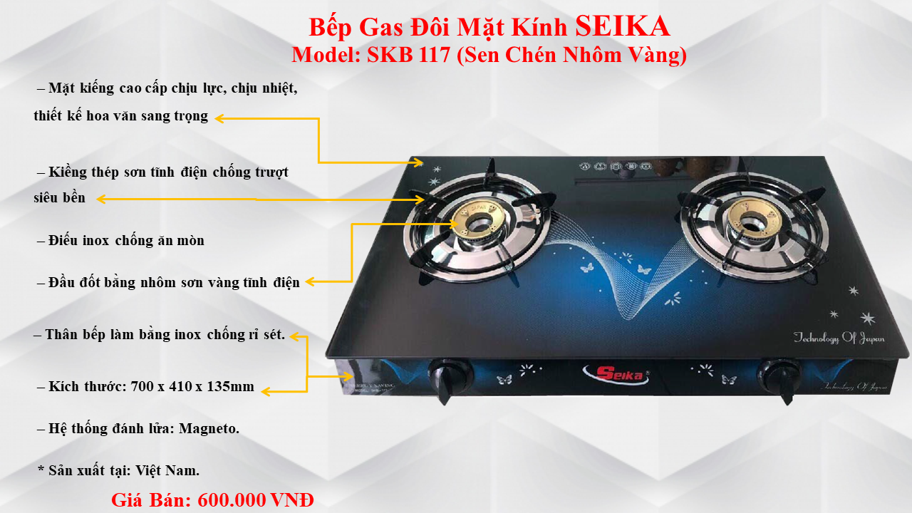 Bếp Gas Đôi Mặt Kính Seika(Sen Đồng)- Mặt kiếng cao cấp chịu lực, chịu nhiệt, thiết kế hoa văn sang trọng - Thân bếp làm bằng inox chống rỉ sét. - Kiềng thép sơn tĩnh