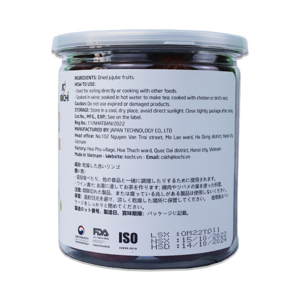 Khối lượng tịnh: 250g. THÀNH PHẦN: - Táo đỏ sấy khô. HƯỚNG DẪN SỬ DỤNG: - Dùng ăn trực tiếp hoặc chế biến các món ăn tùy theo sở thích. - Ngâm rượu, hãm trà,
