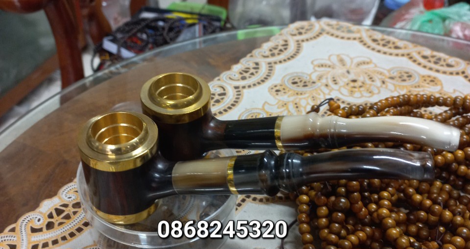 Tẩu hút xì gà gỗ trắc đỏ quý hiếm cán sừng mạ vàng 18K