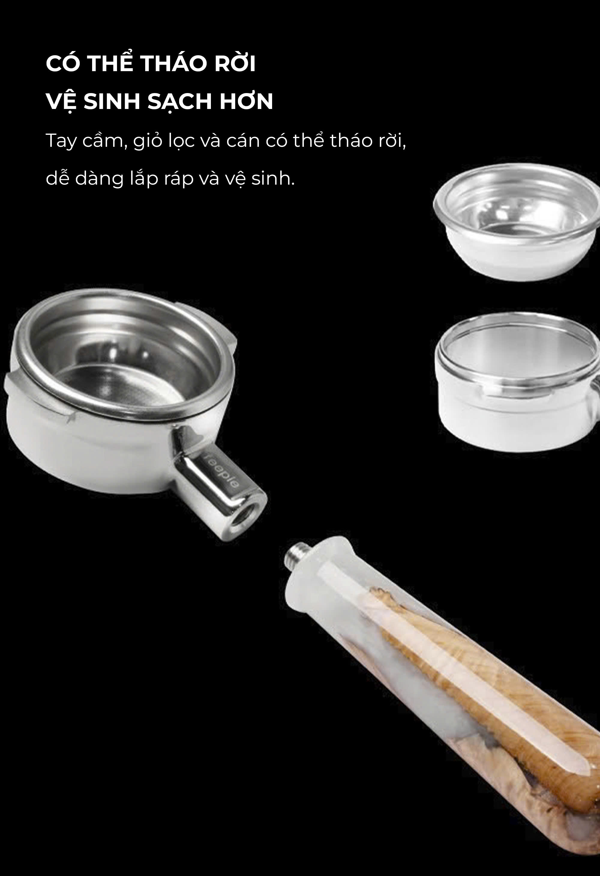 Sự kết hợp tuyệt vời giữa gỗ óc chó và nhựa cao cấp mang đến cho bạn trải nghiệm pha chế espresso đẳng cấp. Tay cầm thiết kế không đáy giúp bạn quan sát quá trình chiết xuất cà phê rõ ràng, kiểm soát chất lượng nước trong mỗi tách cà phê.