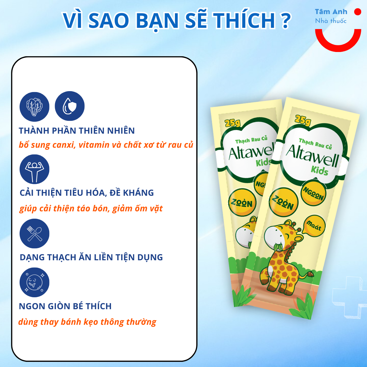 - Thạch canxi chất xơ Altawell với các thành phần chiết xuất thiên nhiên (cải bó xôi, rau má, cần tây) chứa canxi hữu cơ, vitamin và chất xơ hỗ trợ phát triển xương răng, cải thiện tiêu hóa, giảm táo bón, giảm ốm vặt.