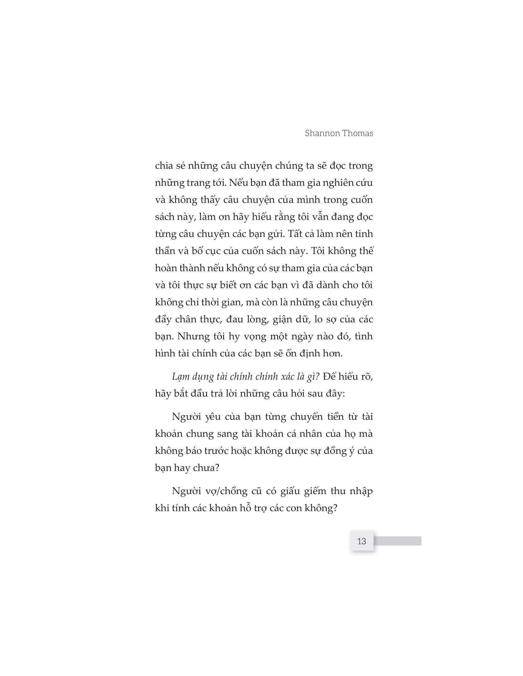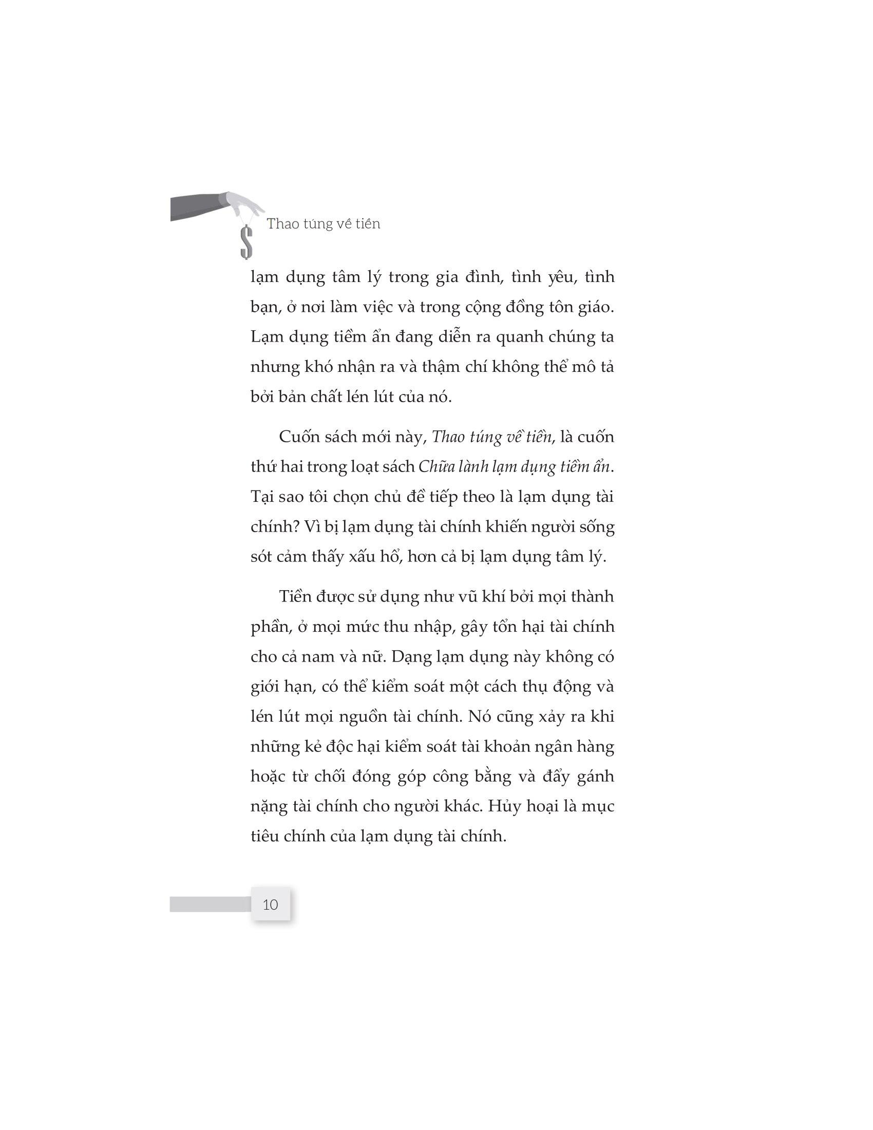 Cuốn sách “Thao túng về tiền” sẽ cho bạn cơ hội vén tấm màn che đậy và thấy được cuộc sống của những người bị tổn hại tài chính do những người thân thiết với họ gây ra. Nó cũng giúp bạn có được cái nhìn cụ thể và sâu sắc hơn về lạm dụng tài chính để nhận biết sớm, có hành động dứt khoát giúp bạn thoát khỏi hố sâu tâm lý và chữa lành những tổn thương tiềm ẩn.