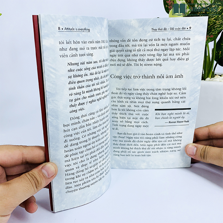 - Nhà xuất bản Tổng hợp TP.HCM Không một quyền lực nào có thể ngăn cản được một người có thái độ, tinh thần đúng đạt được mục đích của mình. Và không có gì trên đời có thể giúp một người có thái độ, tinh thần không đúng đạt thành công. Trong khi người tiêu cực luôn nhìn đời bằng con mắt chán chường, bi quan, thất vọng thì người tích cực luôn nhìn cuộc sống bằng lăng kính lạc quan, biết thay đổi suy nghĩ, biết vạch ra mục tiêu và kiên trì theo đuổi mục tiêu, biết biến trở ngại thành cơ hội, biến bất hạnh thành may mắn. chính vì thế SIBBOOKS giới thiệu đọc giả cuốn sách Thay Thái Độ Đổi Cuộc Đời 1 Tại Sao Nên Đọc Thay Thái Độ Đổi Cuộc Đời 1? Cuốn sách thay đổi một con người từu những suy nghĩ và lối sống tiêu cực, luôn nhìn đời xám màu, hẹp hòi, khuôn khổ, vị kỷ trung tâm trở thành một con người hoàn toàn mới. Review Cuốn Thay Thái Độ Đổi Cuộc Đời 1 Thay thái độ Đổi cuộc đời kể về một câu chuyện có thật và là bức thông điệp tâm huyết từ một người đã từng gặp những khó khăn, vất vả về mặt vật chất và tinh thần - người đã rơi vào tận cùng của đau khổ, bế tắc, chán nản, mất niềm tin cuộc sống nhưng đã tìm cách vượt lên để thay đổi cuộc đời mình đơn giản bằng cách thay đổi thái độ sống. Bằng sự trải nghiệm của bản thân, tác giả đã chứng minh một chân lý có thật trong cuộc sống đó là: Thái độ sống là tất cả, thái độ sống đóng vai trò rất quan trọng đến sự thành bại của từng người. Trong khi người tiêu cực luôn nhìn đời bằng con mắt chán chường, bi quan, thất vọng thì người tích cực luôn nhìn cuộc sống bằng lăng kính lạc quan, biết thay đổi suy nghĩ, biết vạch ra mục tiêu và kiên trì theo đuổi mục tiêu, biết biến trở ngại thành cơ hội, biến bất hạnh thành may mắn. Và kết quả tận cùng của hai thái độ đó rất khác biệt. Người có thái độ sống tích cực luôn nhìn thấy các khả năng và tìm ra những con đường chưa thành lối để đạt đến thành công, hạnh phúc thật sự. Còn người có thái độ sống tiêu cực thì tự giam hãm cuộc sống mình vào các khuôn khổ, lối mòn và chỉ nhìn thấy các giới hạn, khó khăn trong cuộc sống. Hưỡng Dẫn Đọc Sách Hiệu Quả